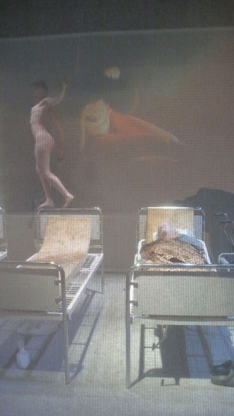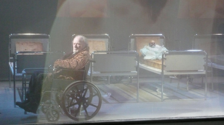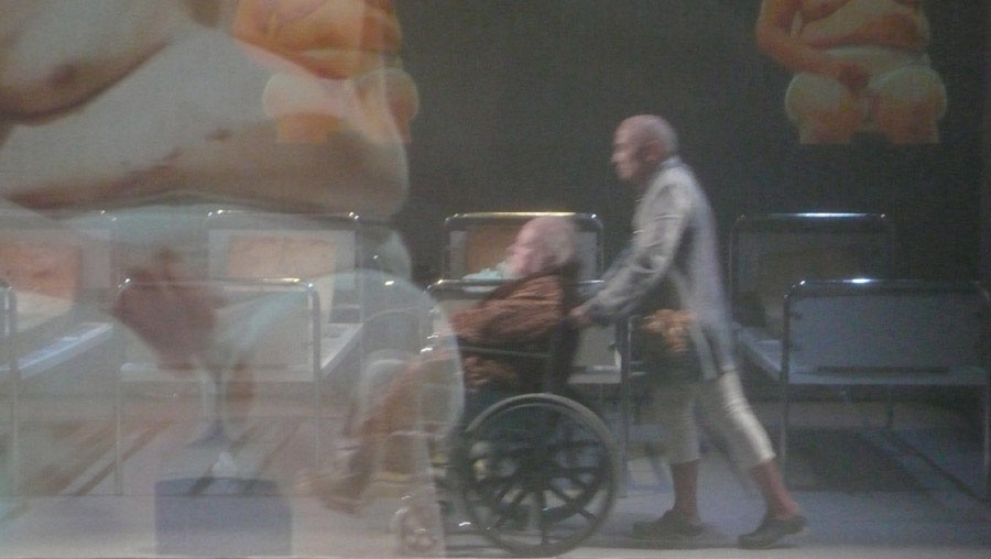 Non c’è limite se non quello fisico, ma il corpo rivela forze inaspettate nelle strade/corsie della città/ospedale assediata dalla morte. Invece, per chi è in-caricato di una mission si aggiunge il peso dell’obiettivo, del risultato. Si assommano vecchiaia a vecchiaia, rughe e piaghe su pelli mollicce, andature incerte a dita contorte, cervelli in default davanti a uno scopo. Quale scopo se non vivere – imploranti e maledicenti - fino all’ultimo istante? Tra i vecchi addormentati l’ombra della sposa dimenticata – Creusa - riappare nel corpo nudo e ferito di una Regina Loca (pazza).