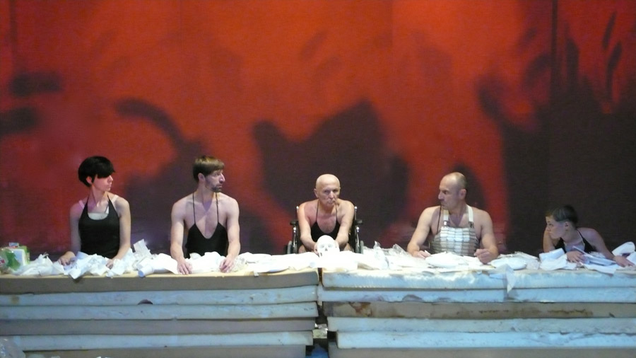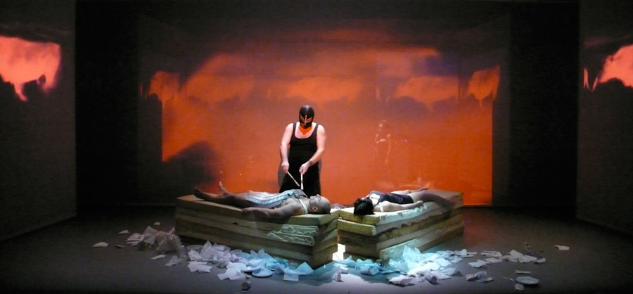 In questo quadro si celebrano i giochi funebri in onore del padre. Un episodio corale intonato dall’ensemble Black|punk con gli OvO, scuola gladiatoria contemporanea, che eleva e fa vibrare questa performance funebre a imperitura memoria del vecchio histrione. Giochi, giochi in onore dei Vecchi, giochi di giovani e di vecchi, esperienza e tracotanza, pazienza e fretta sciocca per arrivare dove c’è una meta, uno scopo che appare divino ma che si svela un’ombra. L’ombra di un gesto sempre uguale, un movimento dall’alto verso il basso a calare il sipario sulla testa del morto.