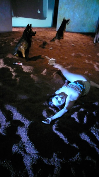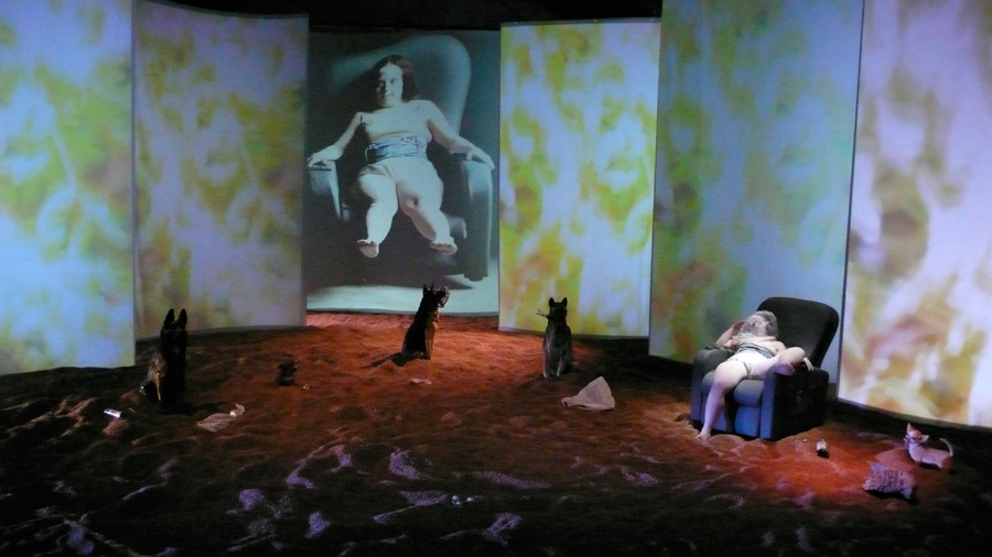 E’ annegata la Sibilla di Agua (Barbara Voghera), il suo corpo in decomposizione fluttua inerte tra le onde secche che bagnano le rive dell’Isola dei Cani. Come la Sibilla michelangiolesca in bilico sul piccolo piedistallo cubico, questa Ofelia soffocata da un sacchetto di plastica appare un balenottero agonizzante spiaggiato sulla sua poltrona scenica.