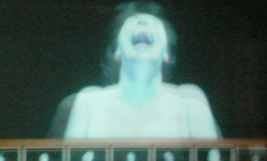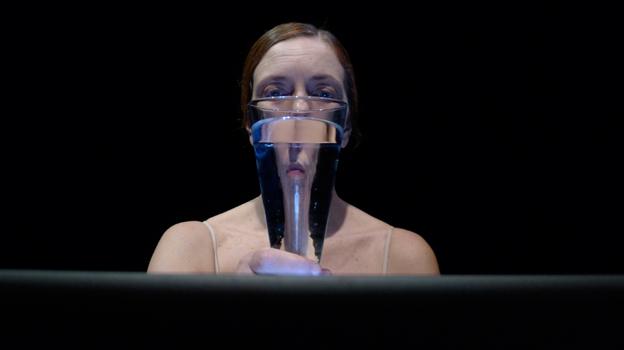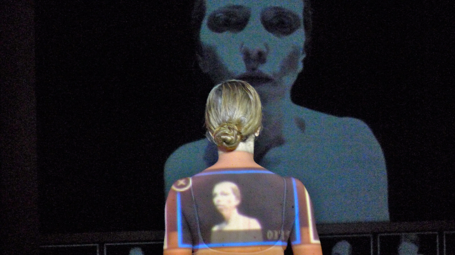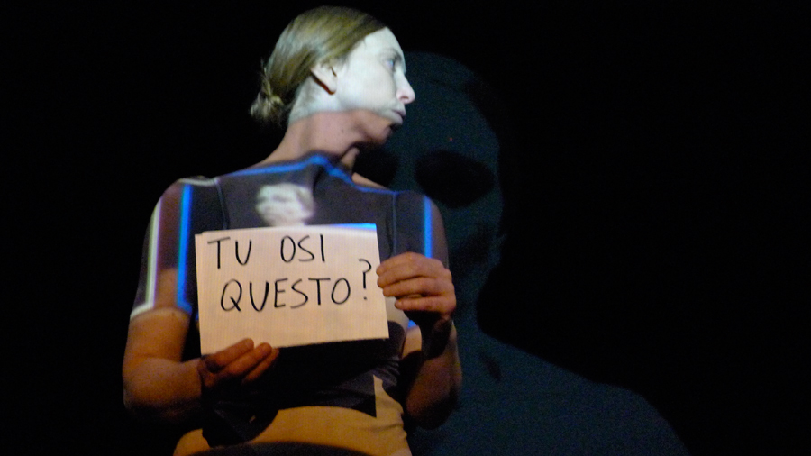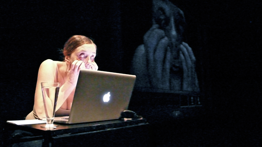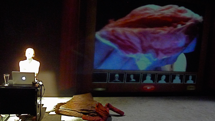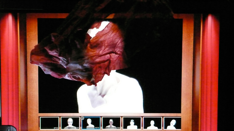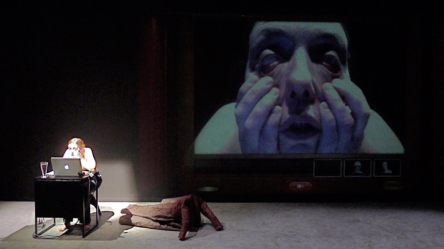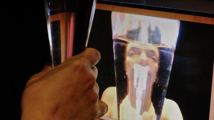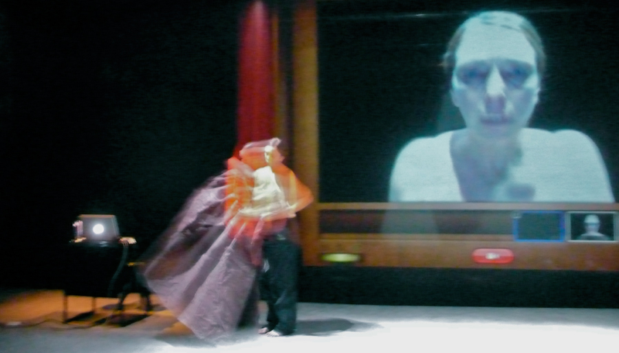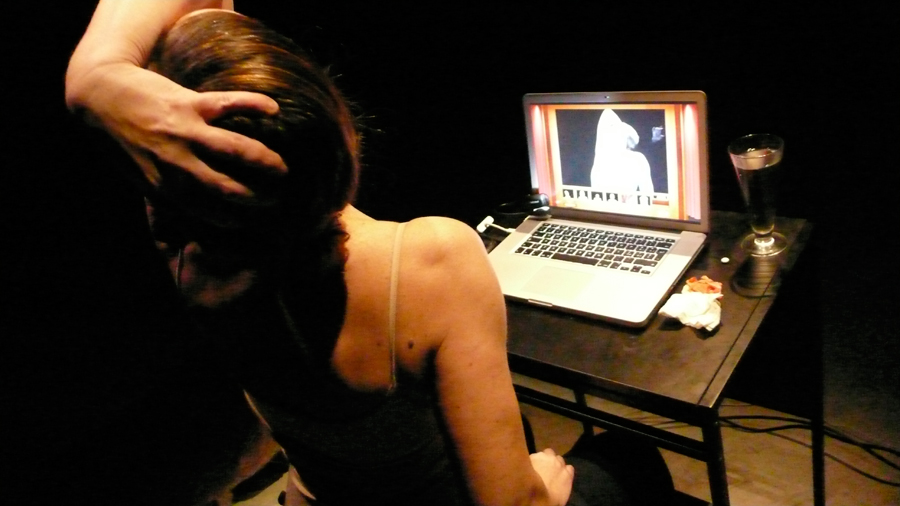 Ultima Regina del proprio esclusivo Io, solitaria amazzone senza più arco, addenta e sbrana se stessa con la voluttà delle parole in versi e con le frecce appuntite degli autoritratti photo booth di un powerbook. Autrice live della propria serializzazione dentro il box del tempo presente - grafìa che fissa il momento dell’atto e del sentimento autorale - autoedifica il dialogo, il combattimento tra l’Io presente e l’Io appena impresso, dilaga sul campo di battaglia scomponendosi in dialogiche relazioni conflittuali, amorose, rancorose, ai limiti dell’assassinio del Sé, del Selbst che tutto comprende. Il corpo fisico appare, si libera dell’involucro teatrale e opera al MacLibro come alla consolle della propria vita. L’acqua del bicchiere l’annega dentro l’immagine ingrandita in uno schermo nero palcoscenico/bocca che tutto ingoia e il libro d’acciaio si fa affilato e appuntito come un coltello.