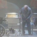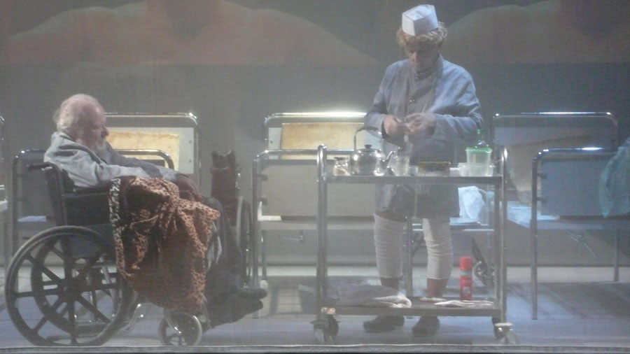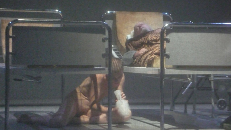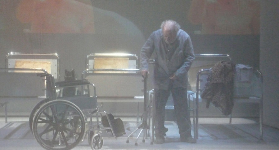 Non c’è limite se non quello fisico, ma il corpo rivela forze inaspettate nelle strade/corsie della città/ospedale assediata dalla morte. Invece, per chi è in-caricato di una mission si aggiunge il peso dell’obiettivo, del risultato. Si assommano vecchiaia a vecchiaia, rughe e piaghe su pelli mollicce, andature incerte a dita contorte, cervelli in default davanti a uno scopo. Quale scopo se non vivere – imploranti e maledicenti – fino all’ultimo istante? Tra i vecchi addormentati l’ombra della sposa dimenticata – Creusa – riappare nel corpo nudo e ferito di una Regina Loca (pazza).
