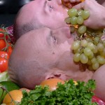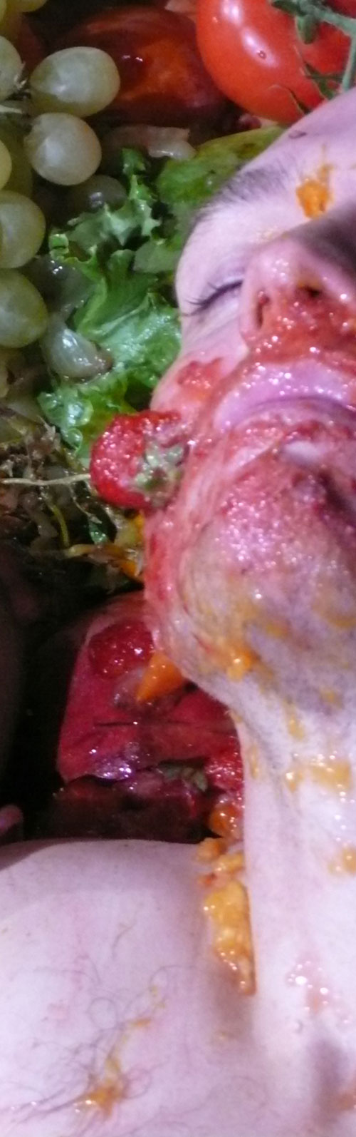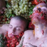 In mezzo a tanto rosso, si succedono immagini di una natura di pietra, di lava, di efflorescenze vegetali e concrezioni minerali, mobile scultura ctonia per proiezioni che si apre a paesaggi di frutta e ortaggi dove i corpi dei giovani contendenti sono stesi fino a sbranare frutti e a rigettarne le carni, a strapparsi dal petto parassiti per sanguinarne, in figurazioni barocche, da trionfo della morte, da natura tanto rigogliosa da confinare con l’inevitabile putrefazione.