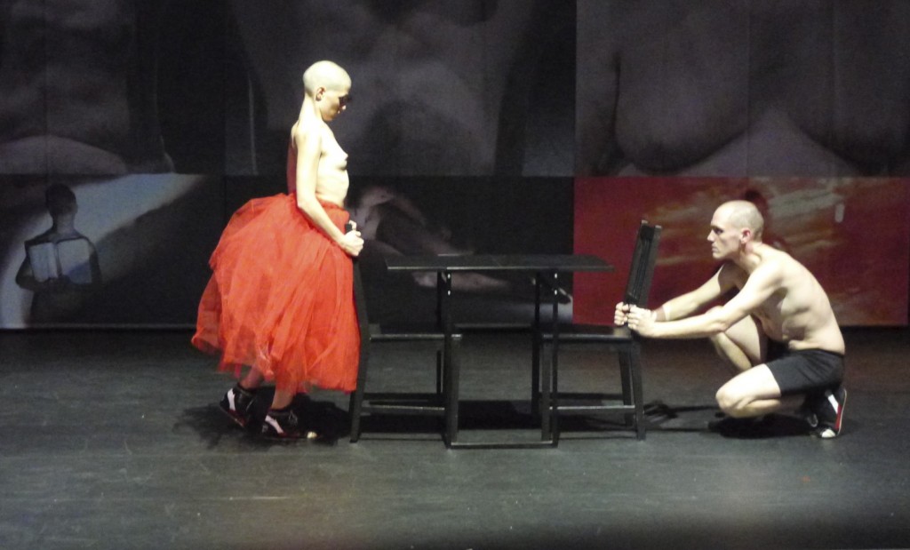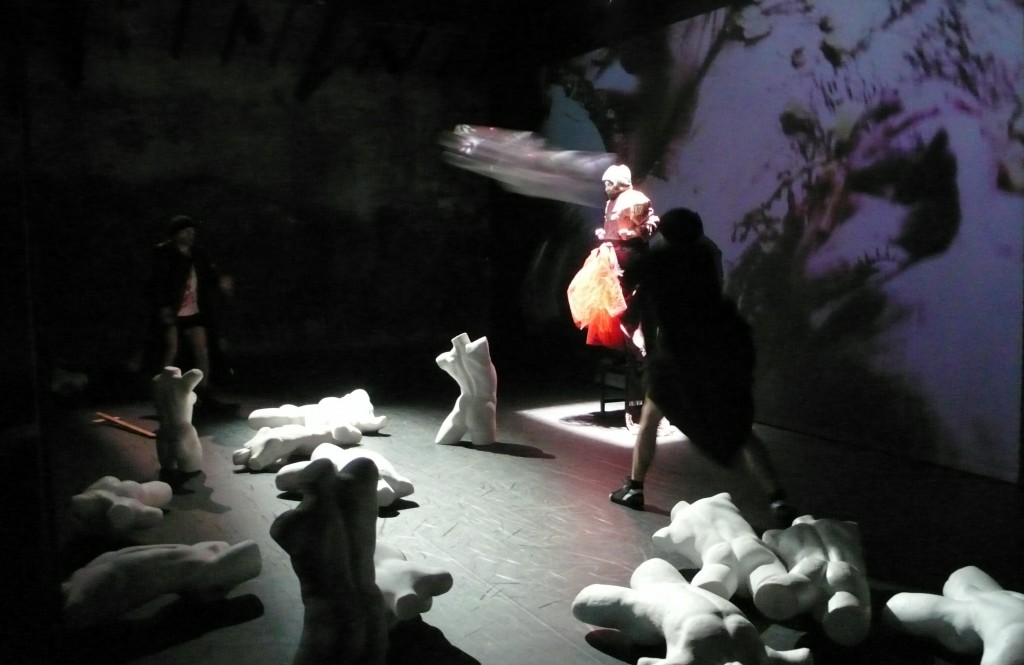 Lo spazio è suddiviso in tre parti da due pannelli in cui vengono proiettate le immagini, uno in primo piano, laltro sullo sfondo: al centro i corpi sfatti dei tre attori, due uomini e una donna. Nel corpo nudo di lei, smagrito e martoriato ci sono i segni della guerra, del conflitto, della distruzione. Le sue membra imbellettate con stemmi e vessilli scimmiottano un potere svuotato, un involucro senza carne.