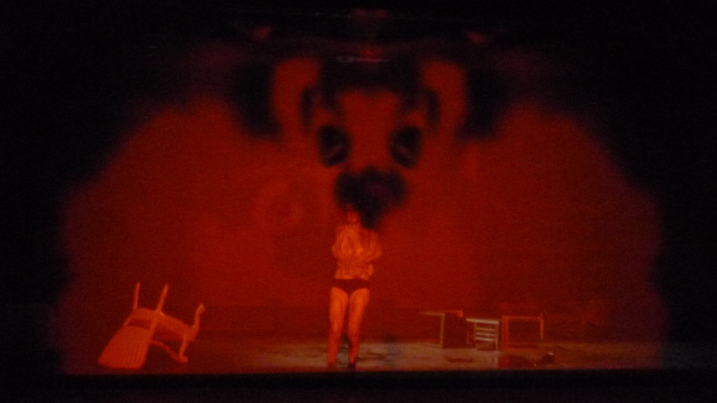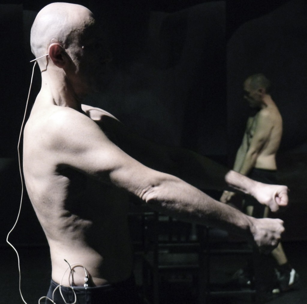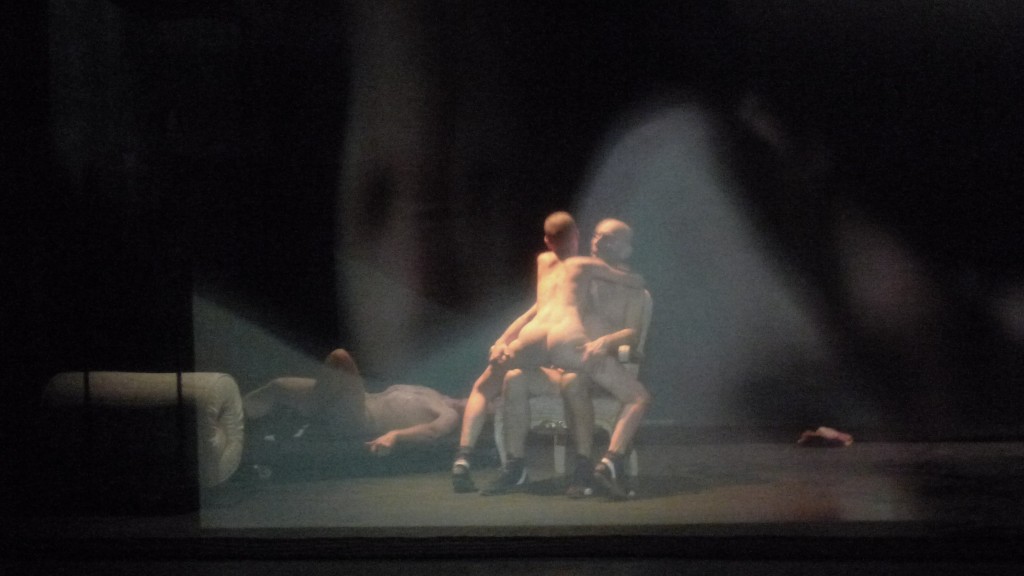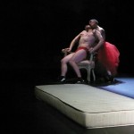 La distruzione comincia proprio dal luogo: lo spazio ingabbiato tra i due schermi, allinizio è linterno di una casa borghese, con tavolo e sedie, una poltrona e un materasso; poi le sedie sono scaraventate a terra, il materasso viene riavvolto su se stesso in un gesto reiterato, segno di un tentativo di ricomposizione nel disordine, un accenno di ordine nel caos. Resta la poltrona a troneggiare sulla scena vuota, culla di un fantoccio destinato a morire. Le immagini degli attori proiettate moltiplicano lo sguardo dello spettatore e rivelano una nascosta identità, svelano unazione non compiuta sulla scena, rappresentando contemporaneamente inconscio subconscio e alterego. Sono piani che si sovrappongono: la forza dell’immagine viene vivificata dalla potenza del corpo.