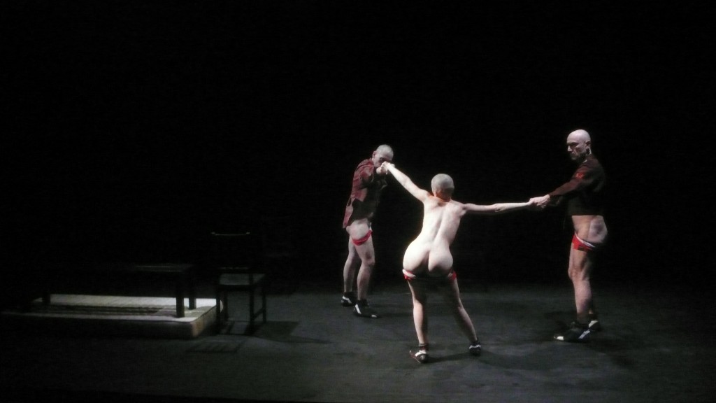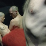 La cancellazione della umana pietà nei confronti del nemico trafitto genera anatomie raffreddate, disumanizzate, corpi senza volto e senza nome, soldati sconosciuti. Nessuna differenza tra uomo e donna. Calva e nuda l’attrice, calvi e nudi i due attori. Persino il mito della Lupa si declina in un vorace pasto di morte. Da piccole mammelle stremate di una madre minuta e prosciugata si nutrono due figli già uomini, più grandi e forti del corpo materno che li ha partoriti.