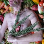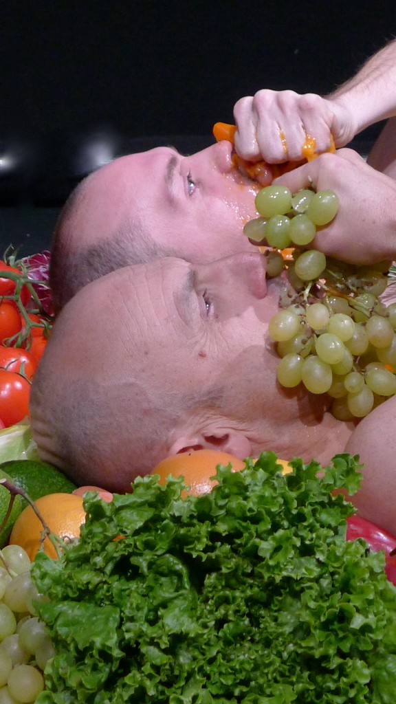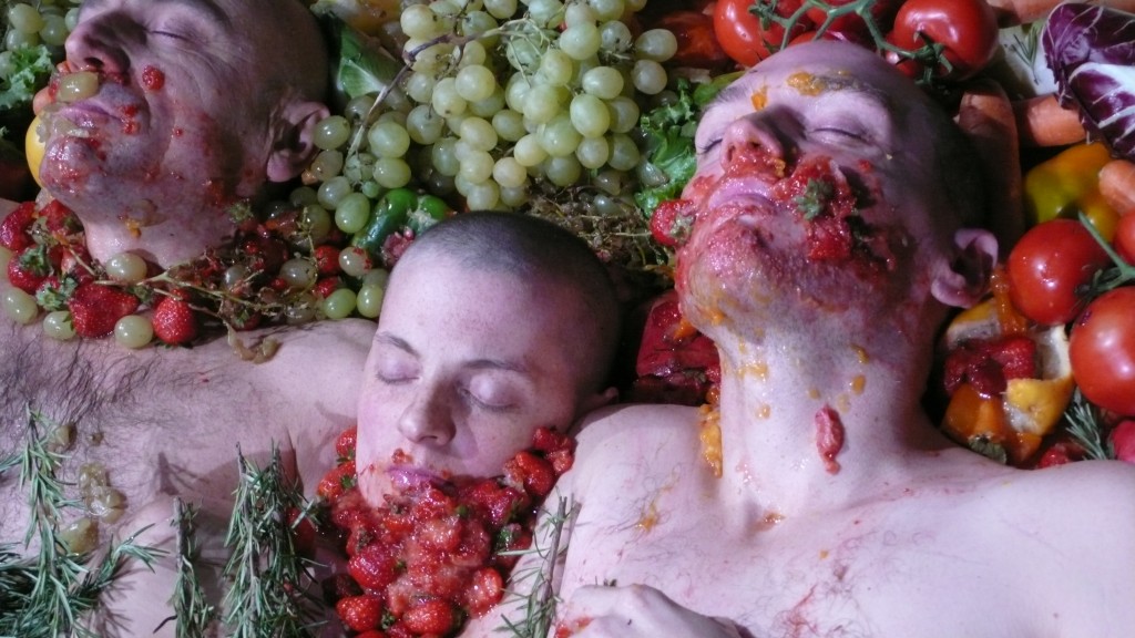 In scena, in numerosi momenti, corpi nudi, martoriati, violentati, deprivati dell’identità di fanciullo o di fanciulla. Non sono altro che carne da macello, destinata a disfarsi, a decomporsi, a diventare cibo per vermi, un tutt’uno con la terra che ne accoglie la putrefazione. Mentre in scena si consuma la battaglia tra combattenti anonimi ridotti a leggeri busti di polistirolo bianco lanciati nella mischia senza neanche indosso una divisa, sulle retinature, le immagini proiettate mostrano anatomie umane mescolate alla terra e ai suoi frutti, come in una livida natura morta di Caravaggio. Dalle bocche vomito, dalle mani rivoli di liquido sanguigno esploso da succosi frutti rossi. Il paesaggio bucolico attraversato da Enea diviene cimitero a cielo aperto di un campo di battaglia abbandonato.