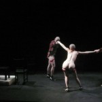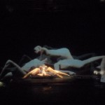 Ho visto gli ultimi capitoli – dal 7 al 12 – affidati a tre corpi nudi, impiastricciati di bianco, due uomini e una donna. Essi giocano, lottano, litigano, si scontrano, saltano, danzano, parlano. Sono stridori, amplificati dal cupo suono – elaborato live da Andrea Azzali – che fa dell’Eneide una partitura della sofferenza, una storia mitica che invece racconta bestialità, violenze, sopraffazioni. Nell’eterno ritorno dell’uguale di un italietta sempre devastata, ingrigita, volgare.