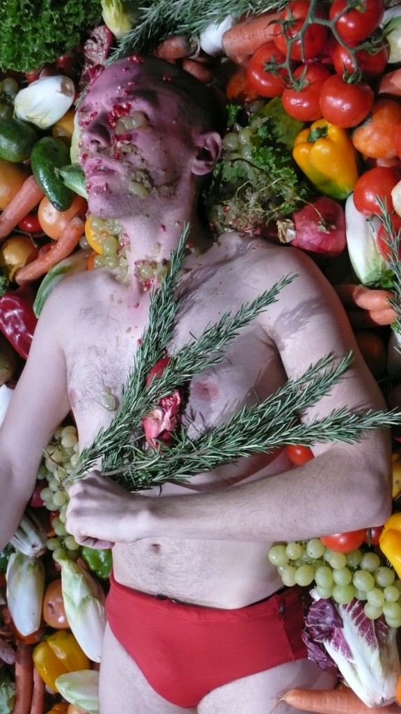 Limmagine che fa da copertina allopera, racchiudendo tutti i significati di cui essa diviene portatrice, è quella che ritrae i corpi nudi degli attori in una natura morta contemporanea: tre uomini spenti affogati nelluva, intinti del rosso delle fragole, accarezzati da rami di rosmarino.