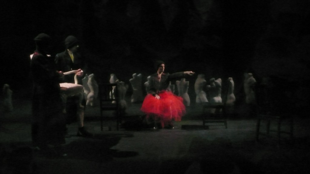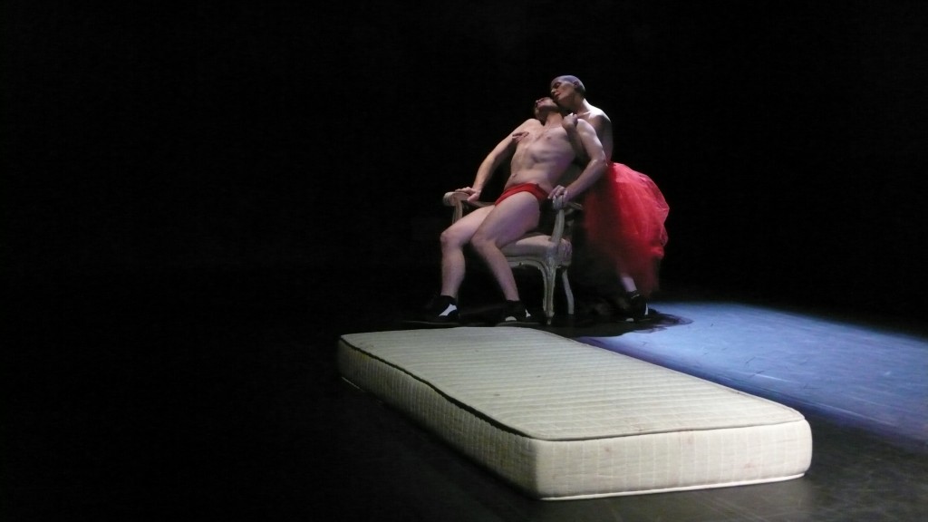 La scena è avvolta da proiezioni, che ricreano un ambiente equivalente alla cripta dell’Ara Pacis, il monumento alla pacificazione augustea. Intorno, il sangue di corpi sprecati in lotte, arrossati da gonnellini simili a tutù, rasati come superstiti di mondi emarginati, come prigionieri, come sopravvissuti a case di contenzione, come militi di guerre sempre perse. Un materasso arrotolato, all’inizio, alcune sedie di paglie, precarie tribune richiamano l’arrivo di Enea in Italia in cerca di casa, le alleanze e le successive lotte, per poi lanciarsi in collegamenti con gli anni di piombo e in altre marce militari, mentre uno dei personaggi si erge come vecchio incitatore alla battaglia dalle carni cadenti, statua augustea sui fori imperiali, che richiamerà altre fiamme, altro rosso, altro sangue, e poi altri gruppi statuari ricreati nel corso dell’emozionate performance, una processione di torsi senza teste né braccia né gambe schierati come esercito e poi lanciati gli uni contro gli altri in assurda battaglia, intrecci di corpi che si chinano e si intrecciano, si stendono, si contorcono e alla fine rivelano un grottesco, deformato gruppo scultoreo rimandante alla lupa capitolina che nutre i due gemelli Romolo e Remo.