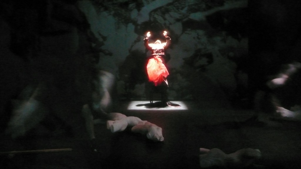 Gli attori alla fine sono infagottati di stracci che li cancellano, poi di nuovo nudi, mentre un’ombra nera ingoia lo sfondo e la scena nel nulla di un buco di antimateria, antivita, che è il trionfo del massacro, antico e moderno, di Enea contro i latini e di Mara Cagol contro lo stato e dello stato contro Mara Cagol, di un giovane cervo straziato e di adolescenti corpi immolati, fino alle sculture finali rievocanti una dubbia grandezza, in uno spettacolo che tiene sempre sul ciglio della sedia con le sue sfide intellettuali e emotive, e alla fine ti prende, ti conquista senza condizioni, con i cadaveri ancora esibiti come su uno di quegli antichi carrelli del teatro greco che uscivano dalle porte regie a stragi compiute, mentre dappertutto si diffonde un’insopportabile aria grigia, e si esalta l’ordine sociale come garanzia della trasgressione, la felicità che solo la differenza dà. Giganteggiano nella dedizione senza condizioni all’impegnativo, sfiancante disegno registico Valentina Barbarini, Roberto Riseri e Pierluigi Tedeschi, mentre compare in video il corpo vecchio di Guglielmo Gazzelli e le azioni e le immagini concepite da Pititto e rese installazione da Maestri dialogano incessantemente con i suoni live di Andrea Azzali.