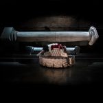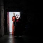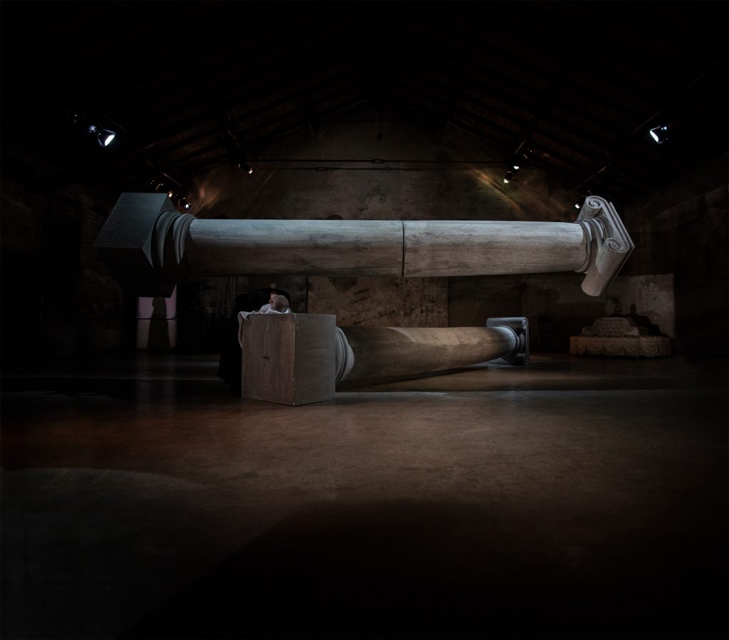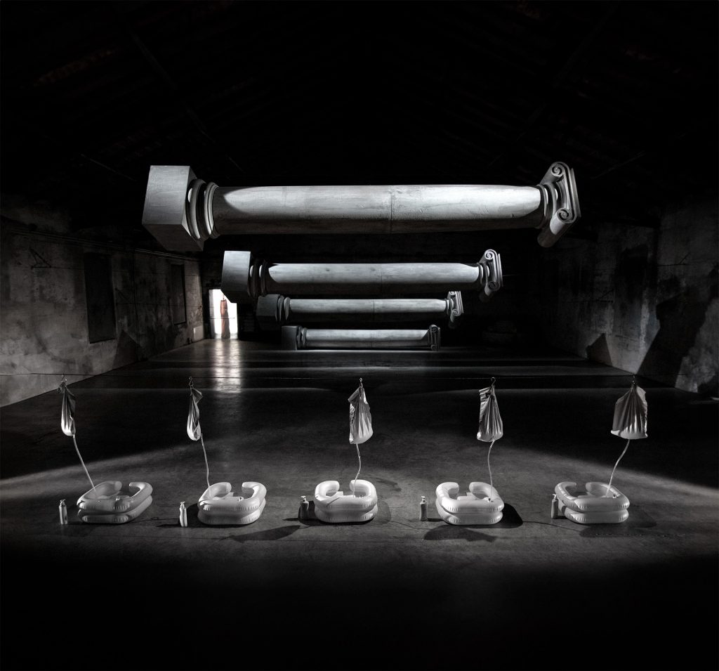 LA PUNTA FINE DELL’ANIMA Il campo di battaglia dell’immaginazione è ampio quanto l’universo, il rombo sismico che travolge ogni confine del reale raggiunge l’apice di un concerto di luce e di buio dove tutto pare fermarsi, le forme mutanti e lo spazio intorno, all’unisono con le strabilianti onde elettromagnetiche. Questo pensiero introduceva l’Apocalisse di Giovanni nella visione di Lenz e con le Apocalissi Gnostiche quell’orizzonte sarà varcato, quando ingoiate nel vortice del ventre oscuro saranno tutte le meravigliose luci delle battaglie catastrofiche e delle prospettive del nuovo mondo che l’opera rivelava agli esseri mortali. Dall’altra uscita del grande antro scuro, ancor più luminose risorgono immagini di altri mondi, altri universi, riemergono materia ed energia colossali, l’insieme degli eoni, la pienezza e totalità dei poteri divini, la scoperta della luce di verità, il Pleroma come grande illimitato buco bianco dal quale sono espulse, emanate e non generate nuove entità divine. L’immaginazione, la conoscenza, la filosofia si appropriano di nuovi archetipi, i testi originari diventano complessi composti alchemici, misteriosi, il verbo diventa criptico e necessita di nuove rivelazioni, di nuovi apostolici testimoni e profezie. Nel nuovo tempo apocalittico della gnosi l’attraversamento delle riflessioni/visioni immaginali che compongono il mondo arcaico e i nuovi mondi non sono per tutti. Solo chi ha la “punta fine dell’anima” o “l’angelo nell’anima” può accedervi. Solo chi rende reale il sogno sarà salvo. Nuove figure emergono, una in particolare, quella di Maria di Magdala. Attraverso un mondo intermedio, in una mediazione tra il divino e l’umano, in un luogo e tempo immaginali Maria Maddalena vede, ed è la prima a vedere quel che nessun altro può vedere. Può ascoltare e potrà rivelare, non può toccare ma solo potrà amare ancora di più colui che già ha amato e ama. “Il linguaggio delle scritture sacre è quello delle immagini e dei simboli che appartengono ai sogni, piuttosto che ai concetti propri delle scienze. L’apparizione che si manifesta a Myriam di Magdala – interiormente ed esteriormente – è Spirito e Corpo, è ciò che fa di Myriam un ánthropos, un essere umano completo_” (Il Vangelo di Maria, Maria di Magdala, Jean-Yves Leloup, Servitium editrice, 2011). Si pensi a come potrebbero mutare le sorti del mondo attuale se “gli esseri umani completi” attraverso l’immaginario collettivo, l’inconscio collettivo che rende l’io uguale al noi, lo stesso identico gesto originario, potessero rendere reale un’esistenza sempre sognata, un altro essere umano ancora più completo dentro una Natura da sempre completa. La poesia che scrive del bene e del male, dell’Angelo che sale e dell’Angelo che cade, dell’Angelo geloso di Lermontov che scaccia l’Angelo del Cielo “_e nell’etere celeste /lento /sprofondava.”, l’arte in ogni forma complessa quanto complesso è l’essere umano, e in particolare il teatro che emana pensiero e azione tramite un corpo mortale come quello di Cristo e della Maddalena, queste rifrazioni di forma e materia e conoscenza rigenerano lo stato delle cose e del mondo, avvertono e formulano profezie sui destini di ognuno, come sentinelle che scrutano l’orizzonte per nuove apocalissi, per nuove immagini da immaginare e rendere reali. Cos’è la resurrezione? NEL DISORDINE PERFETTO Sospese orizzontalmente in un interno segnato dal lavoro operaio al tempo del primo macchinismo industriale, le colonne esfiltrate dalla facciata della Chiesa veneziana della Maddalena, la discepola sapiente prediletta da Gesù, istituiscono uno spazio esorbitante, eccedente, deviante dalla regola della verticale utile ai fedeli obbedienti, inginocchiati e senza sogni. Si oppongono, così sdraiate e disarmate, all’ordinativo basso → alto, dura norma che gerarchizza la salita e la discesa nella piramide plastico-morale di corpi e volumi. Così inutilmente allineate, ci consentono di sfuggire alla vertigine spirituale del doppio collo lungo – della Madonna e della colonna alle sue spalle – illuminazione del Parmigianino e all’orrore sublime del doppio troncone – carnoso del Cristo e di marmo annerito dal sangue – nel Flagello di Caravaggio. Non c’è gloria nella realtà dell’Uomo che soffre sulla croce, ma solo tremendo, insopportabile dolore, per questo amiamo il Salvatore raccontato nell’Apocalisse (gnostica) di Pietro che ci sorride dall’albero a cui è appeso e che, nell’ineluttabile sofferenza del supplizio, si fa sostituire da un ‘prestacorpo’ a sua somiglianza. Trasportati da queste turbolenze dell’immaginazione, convertiti al divanetto dei pensieri di tortora e ai baci senza corpo, le quattro colonne di memoria neoclassica galleggiano nello spazio paludoso della vita activa come barchette o aeroplanini di carta che i bambini sospendono con la mano e spingono nel vuoto col soffio impertinente dell’innocenza. Per la ragion fisica del vero-finto anche queste quattro sorelle dalla fattura pesante prendono il volo e si stagliano nell’aria dando vita ad uno spazio-tempo di pura intuizione, ad un campo di pura sensazione in cui abbracciare l’ombra e ridere del buio. Apocalissi Gnostiche Creazione Maria Federica Maestri ~ Francesco Pititto Maria Dolores Pesce – Sipario Una materia incandescente affidata, prima di potersi raffreddare come un magma, alla consueta mano (e al cuore) sapiente di Maria Federica Maestri che cura la composizione, l’installazione e gli involucri della scena. Una scena dallo sfondo oscuro, un recesso della mente e dell’anima, con una porta illuminata di accesso (l’arte e la fede?), segnata da perturbanti colonne in orizzontale e degradanti, a rappresentare la sospensione del tempo e quindi del logos, sotto le quali, in lavacri ironici e semoventi, o in divani ‘falsi’ come la borghesia che li ha prodotti, tra rossi vermi ch