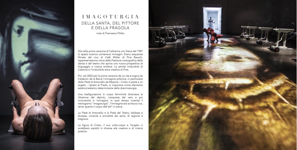 Then, in 2003, for the first version of “Life is a dream” by Calderón de la Barca, the pictorial image, in particular Antonello da Messina’s “Pieta” – Christ in pity and an angel – taken from the Prado, imposed itself as a decisive aesthetic/esthetic element of the dramaturgy. A transfiguration in a female body became the refraction of the painting, composed from life and then reconverted into an image. At that time I invented the neologism ‘imagoturgy’, the image was living writing, as much as the actor’s body on stage.