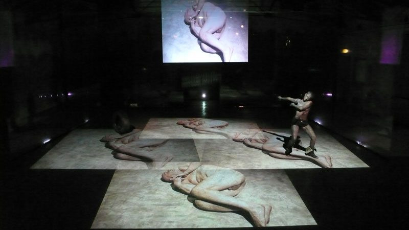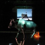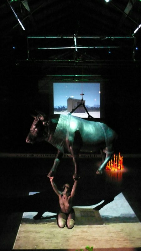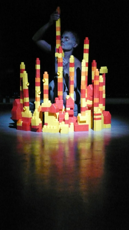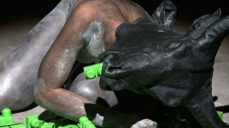 Scorrono i video moltiplicati anche a terra. Lei avrà un libro in mano mentre si avverte la presenza del fuoco. Città da costruire con blocchetti colorati. La donna infine, con la testa di toro, non riconoscerà come cibo quel mucchio di plastica verde. Sono/ siamo legati indissolubilmente uomini e donne, passato e presente, bianchi e neri, stati e continenti, giovani e vecchi: e con <<Dido>> a Lenz è parso di sentire intenso il sentimento cupo della disperazione.