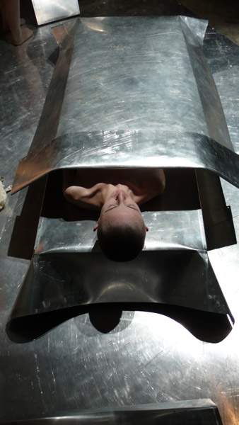 Gli elementi metallici dell’habitat, ormai costretti all’agonia della sovrapposizione e dell’oblio, si sostanziano in una decostruzione definitiva: posti una sopra all’altro perdono la potenza simbolica e creatrice, pronti ad accogliere la partenza e l’esilio definitivi. Nell’esilio finale della barchetta metallica, colma di abiti ed oggetti identitari, si affaccia l’orrore plastico del naufragio dei corpi migranti, in bàlia delle acque che sono costretti ad attraversare in fuga da una terra dove non possono più vivere.