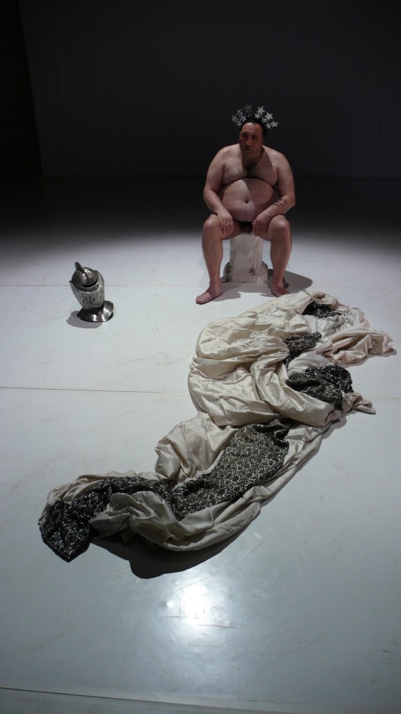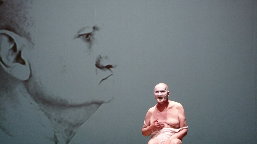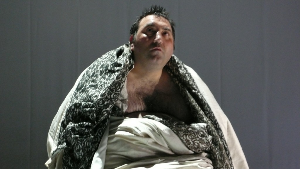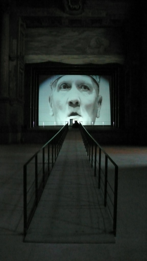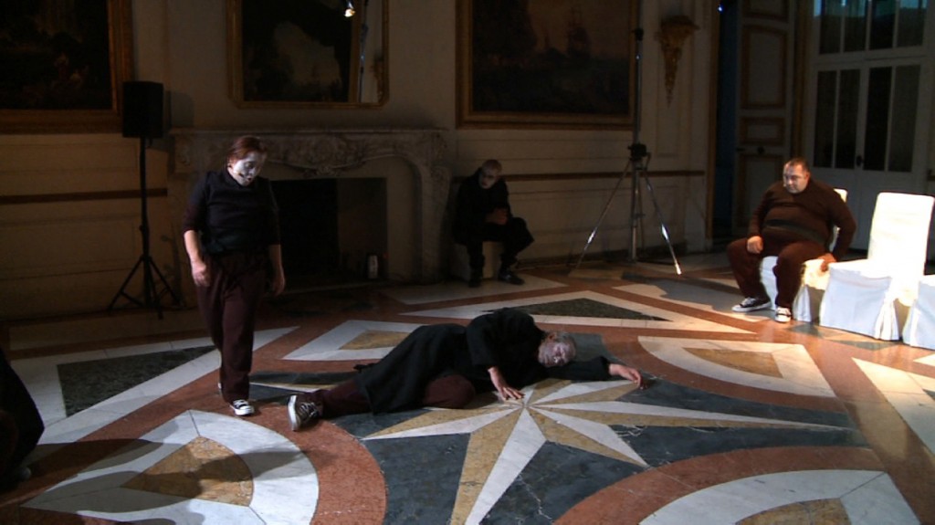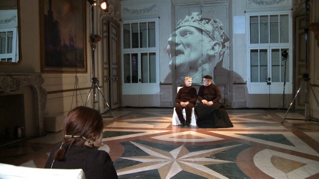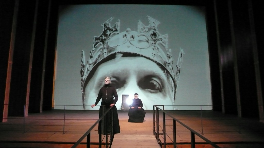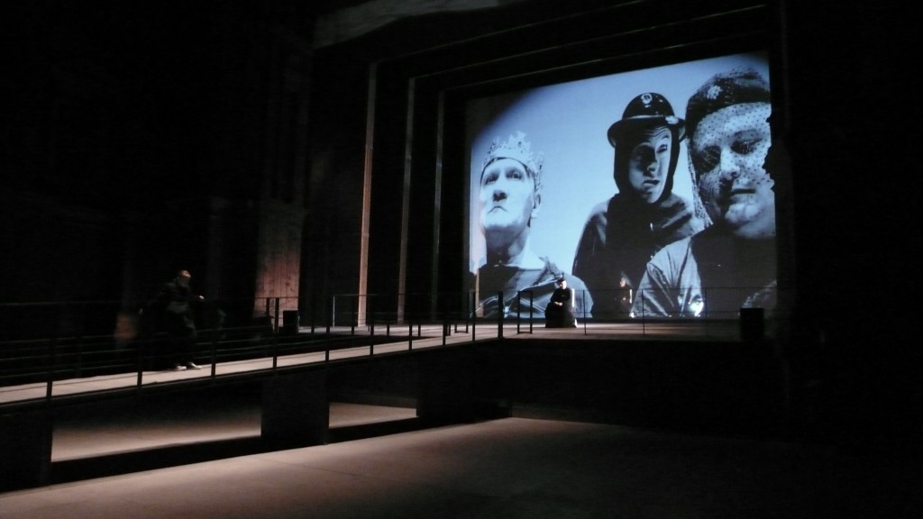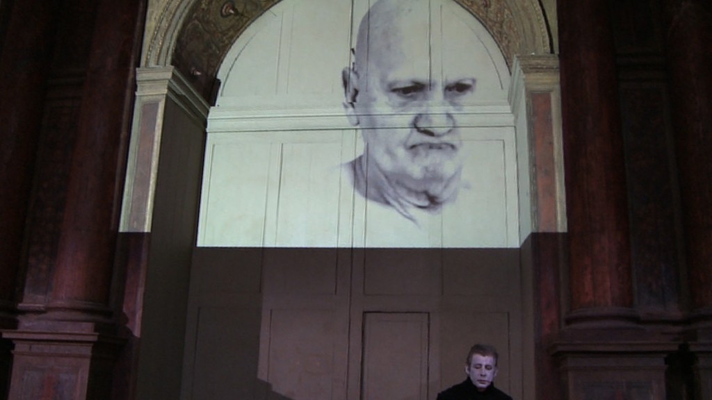 È dal 1999 che Lenz collabora con il Dipartimento di Salute Mentale portando il teatro e l’arte nella vita di chi ha vissuto il manicomio. Ecco che nei loro volti, “trasduttori di forza” (così vengono chiamati dagli autori), nei loro occhi assenti e perennemente sedati – eccezion fatta per l’irrefrenabile donna del gruppo –, si vive quello spaesamento di cui sopra, un continuo malessere di chi guarda con pietas i video nei quali gli attori/pazienti si preparano concedendosi un sorriso o facendosi il trucco, una stretta allo stomaco che d’un sol colpo fa vacillare quel “kritikos” dal quale deriva l’esperienza nel giudizio, per far riemergere improvvisamente la crisi. È un percorso frastornante quello creato tra le sale della Galleria Nazionale, tra busti in marmo, putti che nella semioscurità diventano angoscianti figure appese e amputate, il retropalco e poi la maestosità del teatro. La regina, interpretata da Franck Berzieri, è immobile e minuscola nei 40 metri di palco, attorno il vuoto riempito solo dalle voci, che fuori da qualsiasi canone artistico diventano dolorose cantilene. Sul fondale, in un gigantesco video – come tutti in un bianco e nero dreyeriano – l’espressività della Voghera è prestata a una furente proiezione della regina. Claudio appare solo in video, dolorosa presenza di Guglielmo Gazzelli venuto a mancare pochi giorni prima del debutto, la sua preghiera negata è tra le scene più intense.