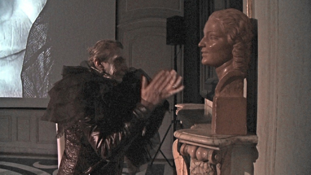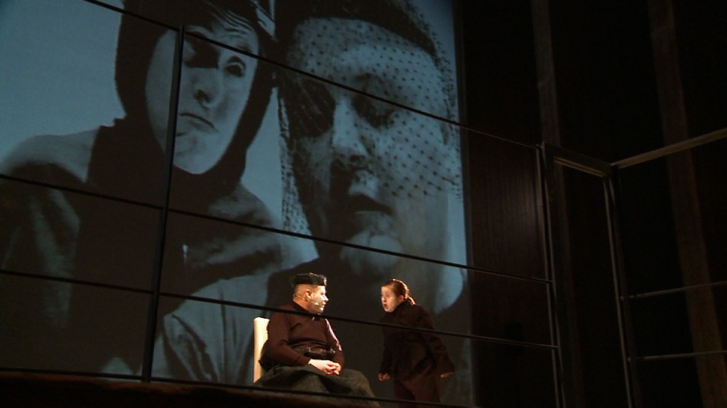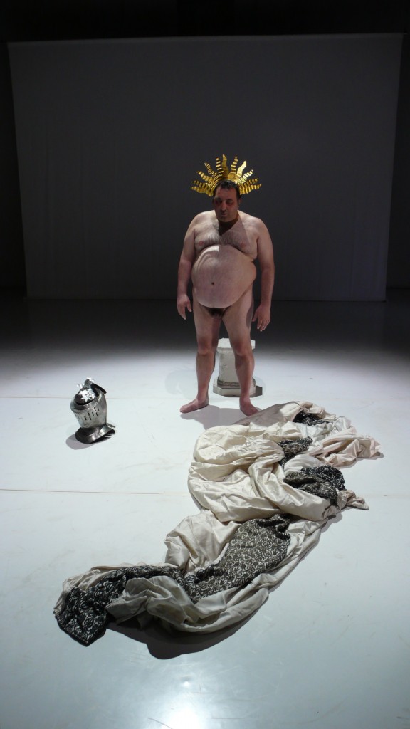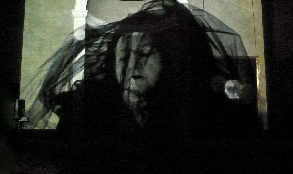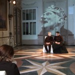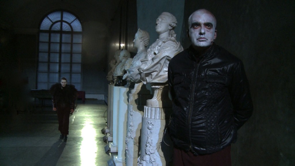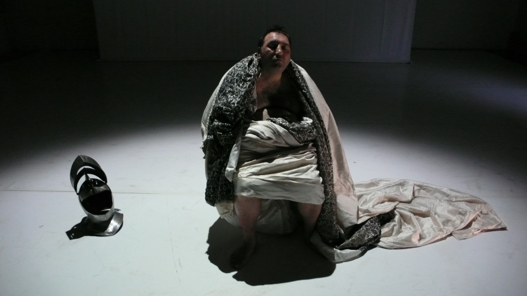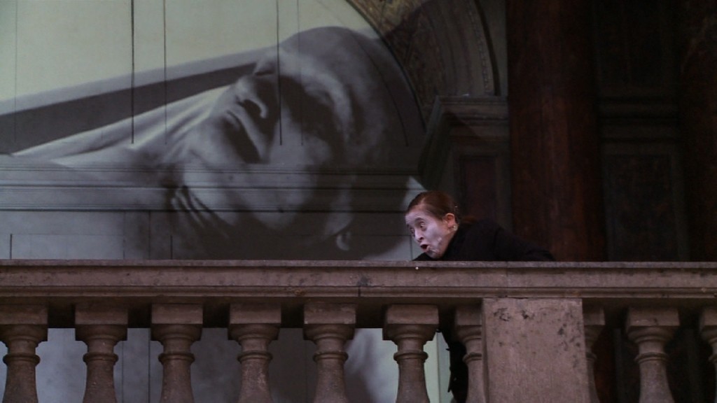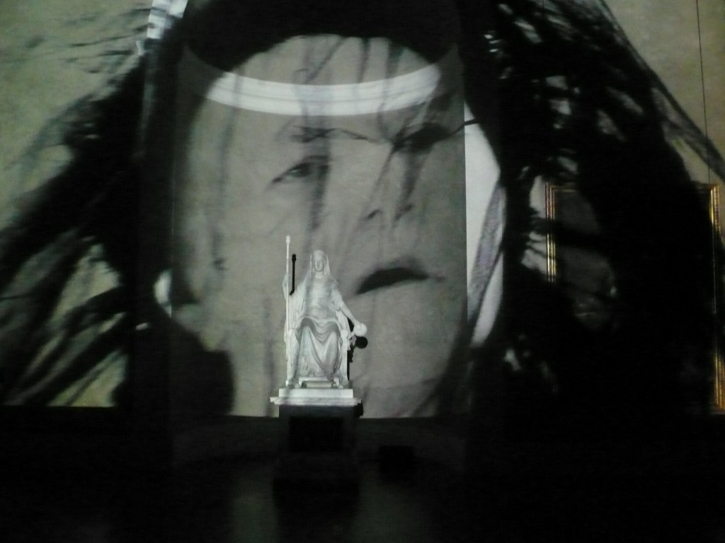 È dal 1999 che Lenz collabora con il Dipartimento di Salute Mentale portando il teatro e l’arte nella vita di chi ha vissuto il manicomio. Ecco che nei loro volti, “trasduttori di forza” (così vengono chiamati dagli autori), nei loro occhi assenti e perennemente sedati – eccezion fatta per l’irrefrenabile donna del gruppo –, si vive quello spaesamento di cui sopra, un continuo malessere di chi guarda con pietas i video nei quali gli attori/pazienti si preparano concedendosi un sorriso o facendosi il trucco, una stretta allo stomaco che d’un sol colpo fa vacillare quel “kritikos” dal quale deriva l’esperienza nel giudizio, per far riemergere improvvisamente la crisi. È un percorso frastornante quello creato tra le sale della Galleria Nazionale, tra busti in marmo, putti che nella semioscurità diventano angoscianti figure appese e amputate, il retropalco e poi la maestosità del teatro. La regina, interpretata da Franck Berzieri, è immobile e minuscola nei 40 metri di palco, attorno il vuoto riempito solo dalle voci, che fuori da qualsiasi canone artistico diventano dolorose cantilene. Sul fondale, in un gigantesco video – come tutti in un bianco e nero dreyeriano – l’espressività della Voghera è prestata a una furente proiezione della regina. Claudio appare solo in video, dolorosa presenza di Guglielmo Gazzelli venuto a mancare pochi giorni prima del debutto, la sua preghiera negata è tra le scene più intense.