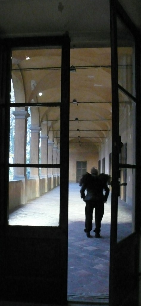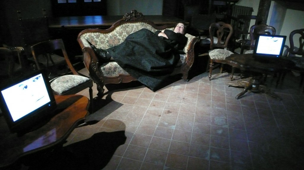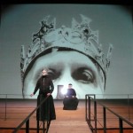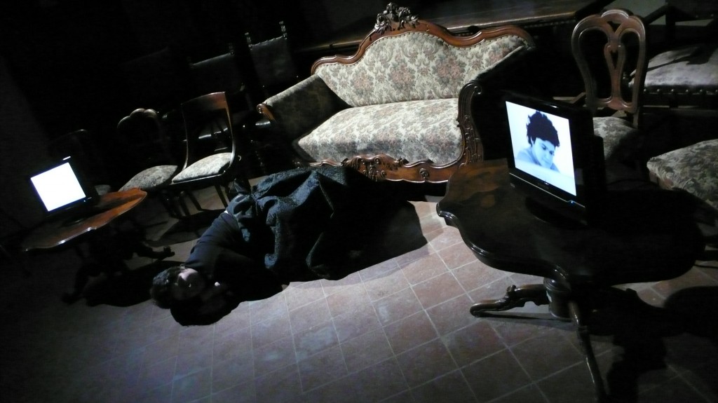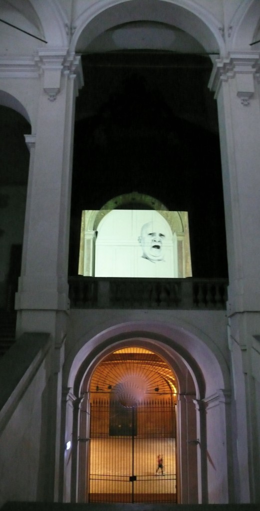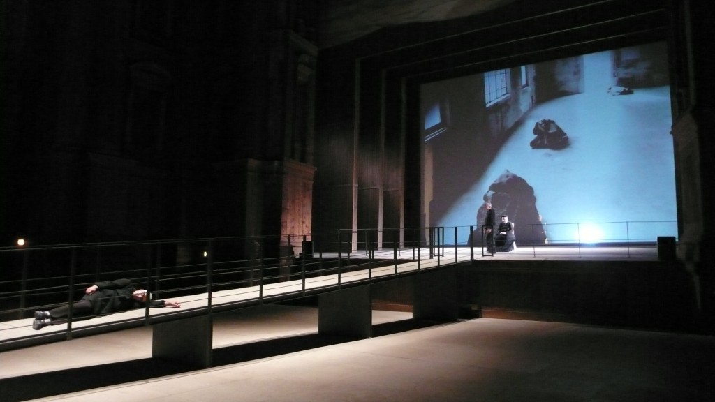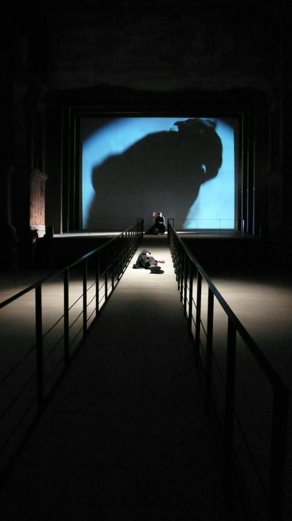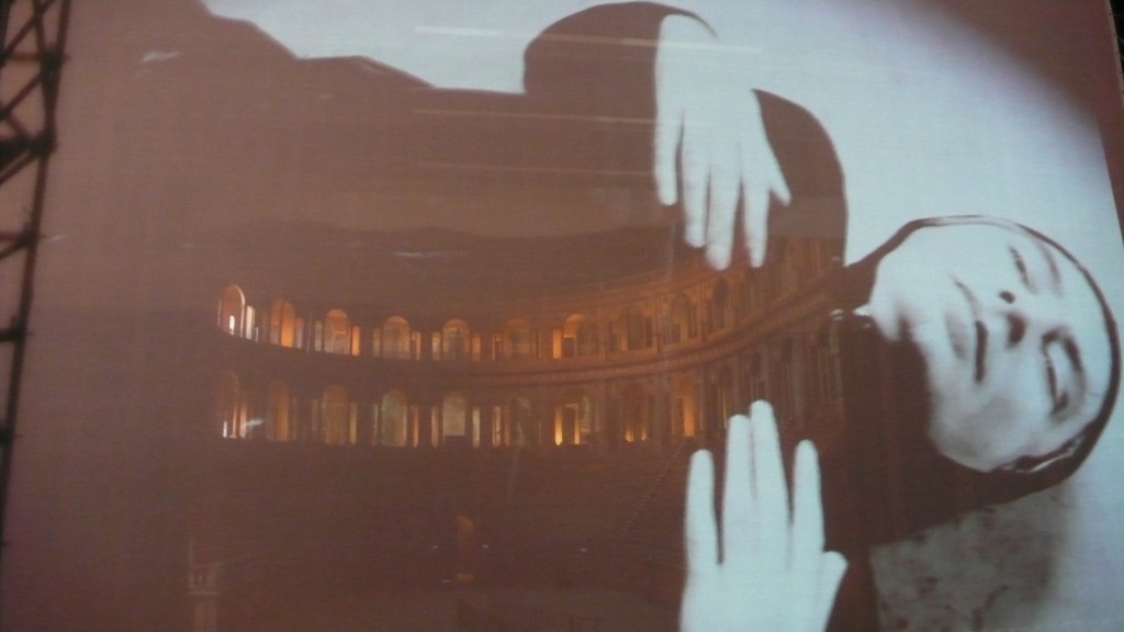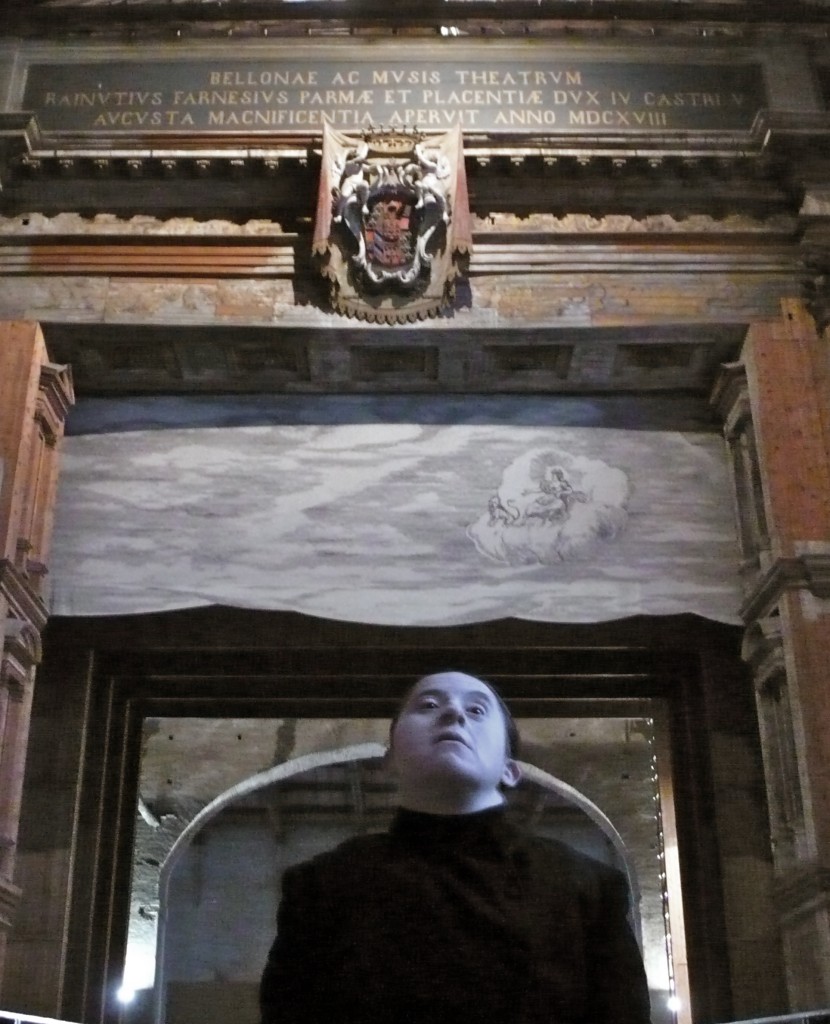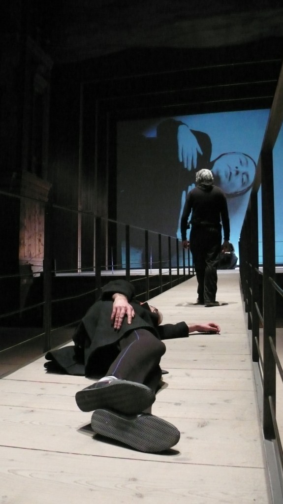 I primi passi nel Palazzo della Pilotta da subito si appesantiscono della grandezza che ci circonda, sulle scale che portano al teatro due attori ci accolgono, a sinistra capiamo che c’è Amleto (Paolo Maccini), neutro, non manifesta un’emozione, sarà la sua maschera naturale per tutto lo spettacolo, a destra Barbara Voghera, è Amleto anche lei, ma la sua interpretazione si oppone diametralmente al primo: si arrampica letteralmente sulla sillabazione della riscrittura di Francesco Pititto, lotta con tutte le forze contro gli impedimenti di pronunzia che le imporrebbe la sindrome di down; cercherà nel suo corpicino una risonanza modulata da continue contrazioni. Sul ballatoio i primi video proiettati (nei quali appare anche il fantasma del padre), ma saranno numerosi e accoglieranno lo spettatore in ogni spazio caratterizzando l’intera scrittura scenica di Maria Federica Maestri. Da sempre questo Amleto è nomade, nel percorso interno dello spettacolo e nella perenne ricerca di spazi non abituali dove installare le proprie emozioni e contraddizioni. Dopo la Rocca dei Rossi e la Reggia di Colorno la collaborazione tra le istituzioni e la compagnia ci ha consegnato questa piccola e fragile utopia del Farnese, purtroppo dissolta con una serata di anticipo a causa del terremoto emiliano.