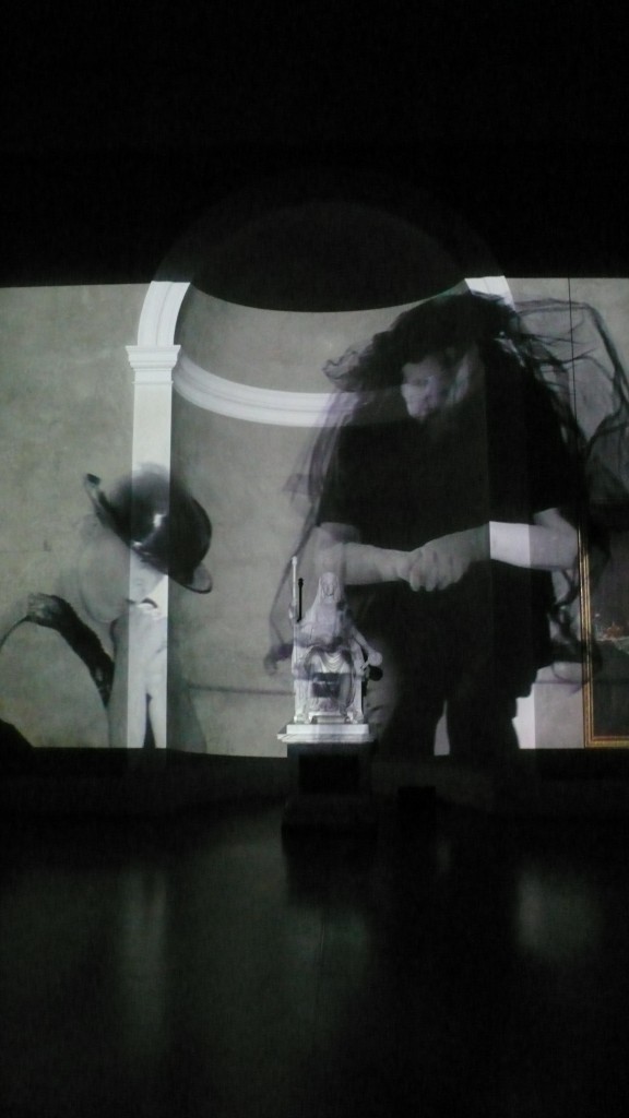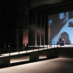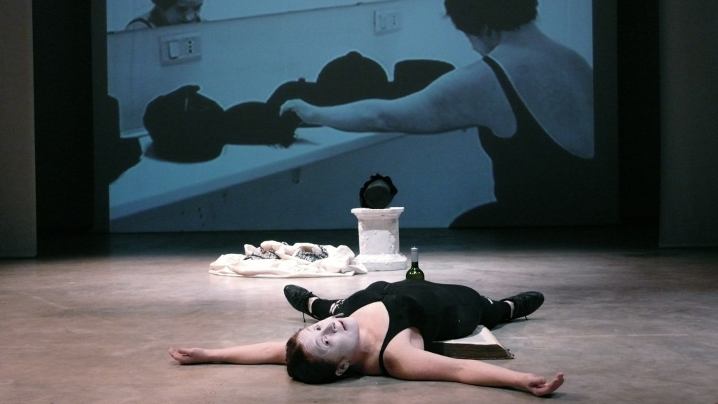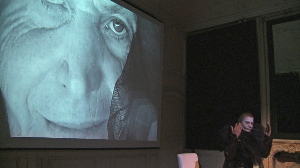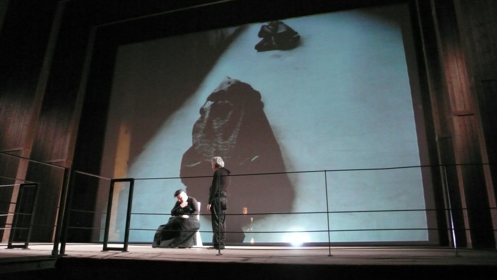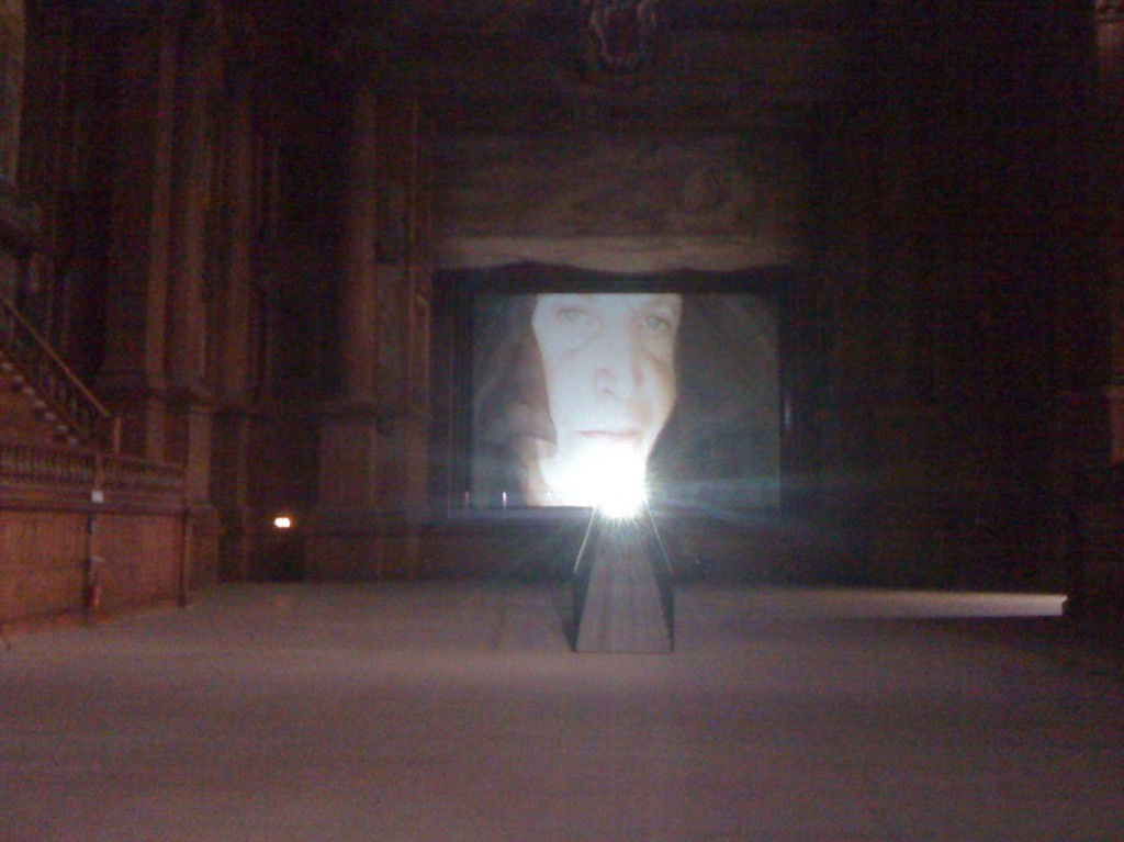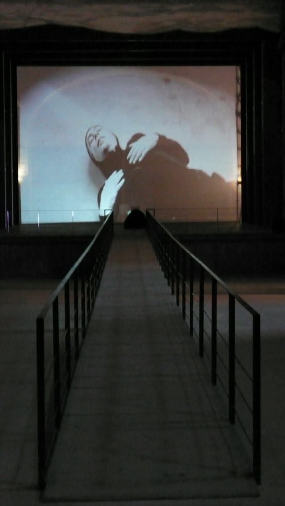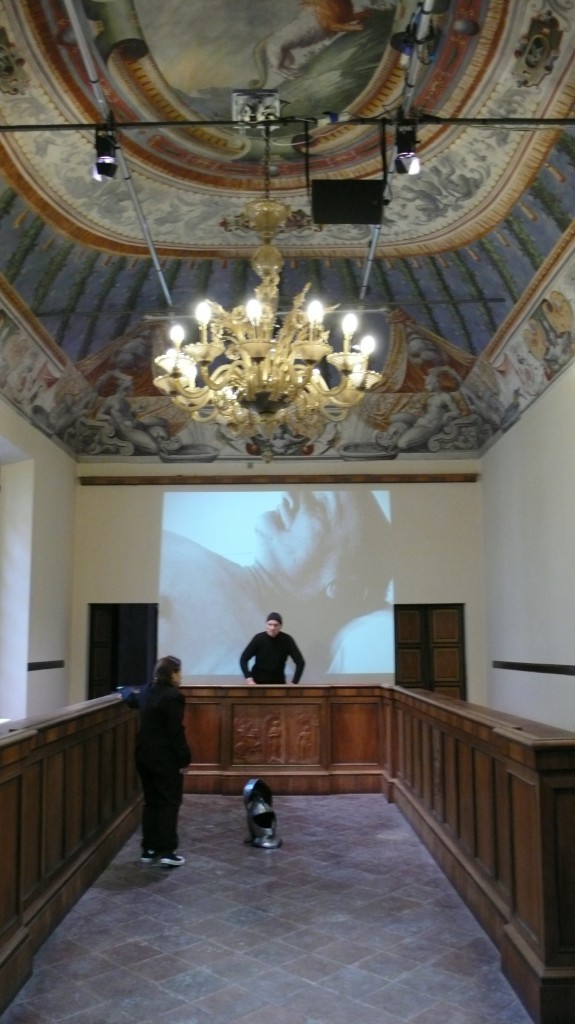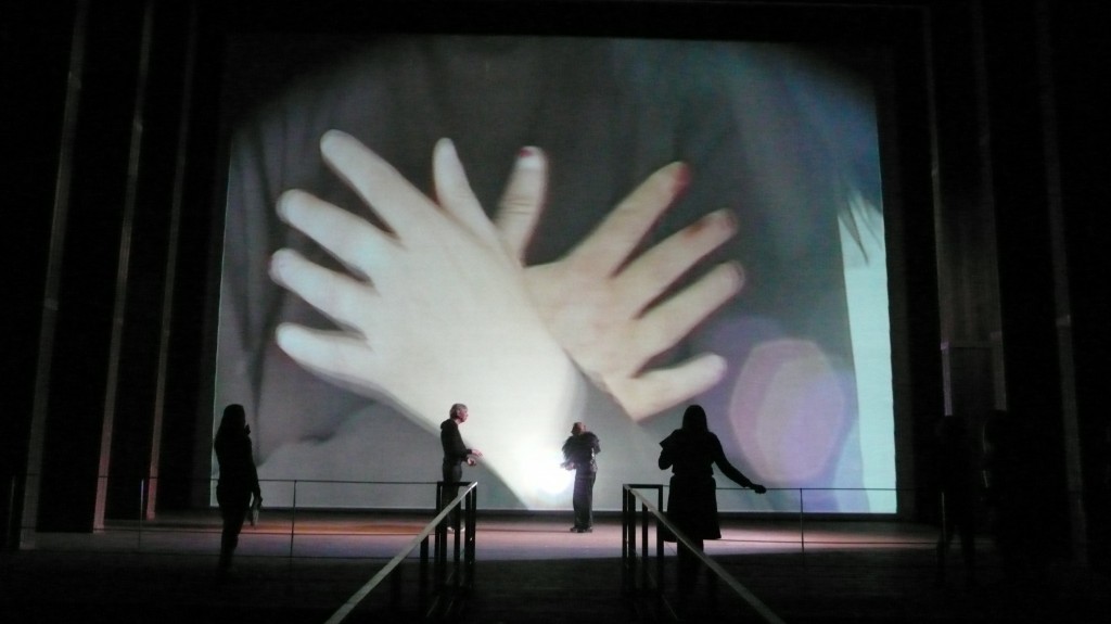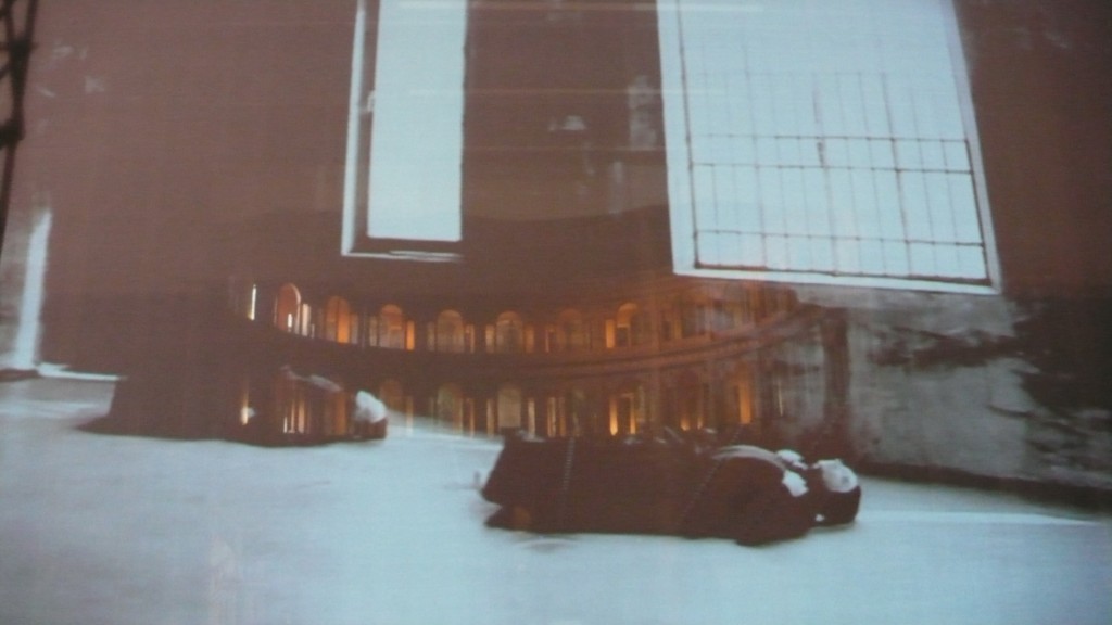 I primi passi nel Palazzo della Pilotta da subito si appesantiscono della grandezza che ci circonda, sulle scale che portano al teatro due attori ci accolgono, a sinistra capiamo che c’è Amleto (Paolo Maccini), neutro, non manifesta un’emozione, sarà la sua maschera naturale per tutto lo spettacolo, a destra Barbara Voghera, è Amleto anche lei, ma la sua interpretazione si oppone diametralmente al primo: si arrampica letteralmente sulla sillabazione della riscrittura di Francesco Pititto, lotta con tutte le forze contro gli impedimenti di pronunzia che le imporrebbe la sindrome di down; cercherà nel suo corpicino una risonanza modulata da continue contrazioni. Sul ballatoio i primi video proiettati (nei quali appare anche il fantasma del padre), ma saranno numerosi e accoglieranno lo spettatore in ogni spazio caratterizzando l’intera scrittura scenica di Maria Federica Maestri. Da sempre questo Amleto è nomade, nel percorso interno dello spettacolo e nella perenne ricerca di spazi non abituali dove installare le proprie emozioni e contraddizioni. Dopo la Rocca dei Rossi e la Reggia di Colorno la collaborazione tra le istituzioni e la compagnia ci ha consegnato questa piccola e fragile utopia del Farnese, purtroppo dissolta con una serata di anticipo a causa del terremoto emiliano.