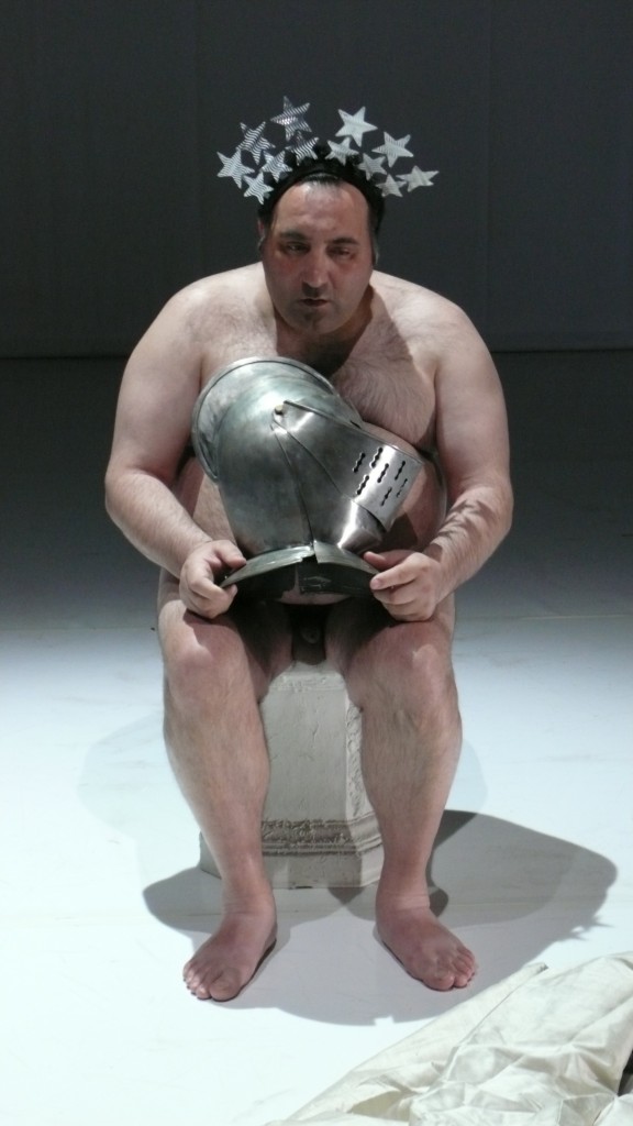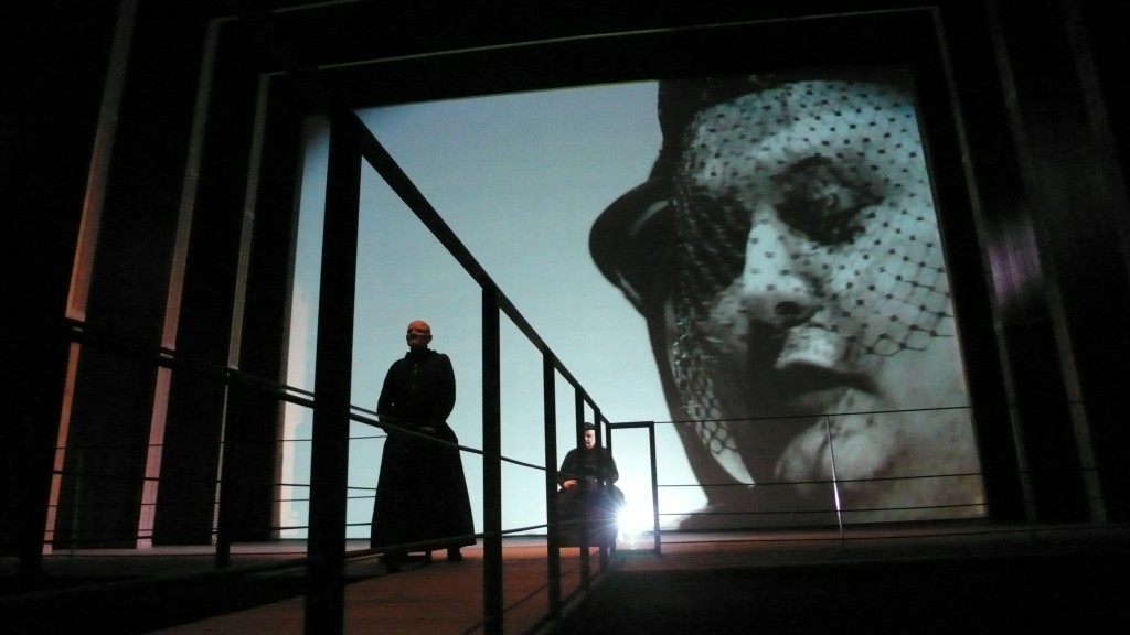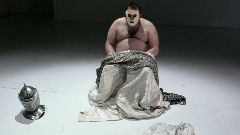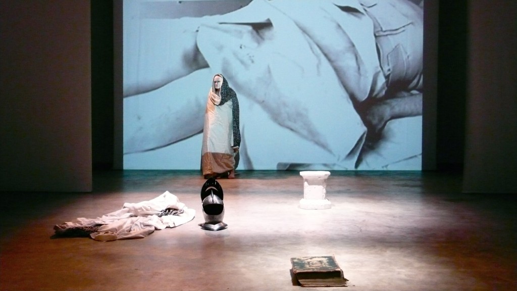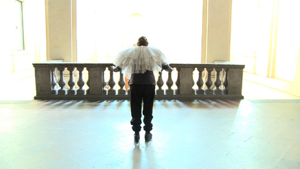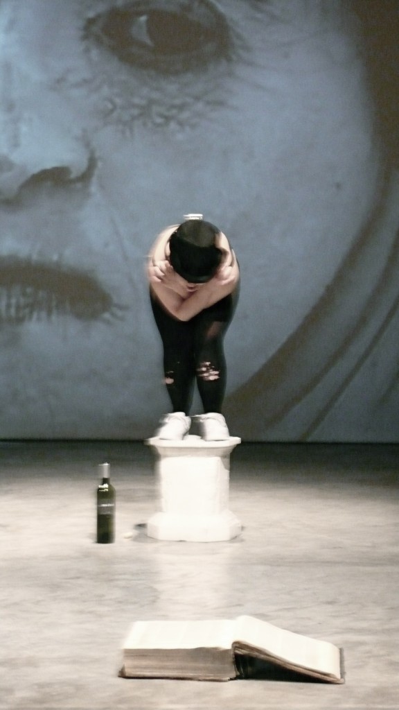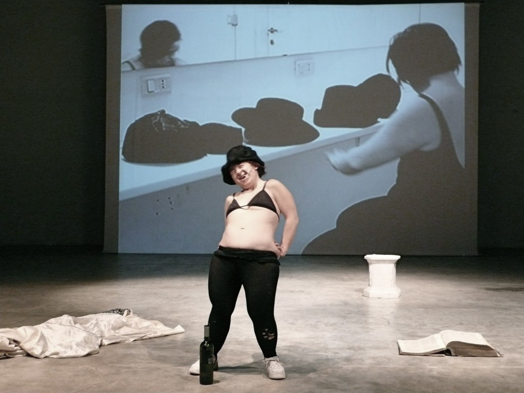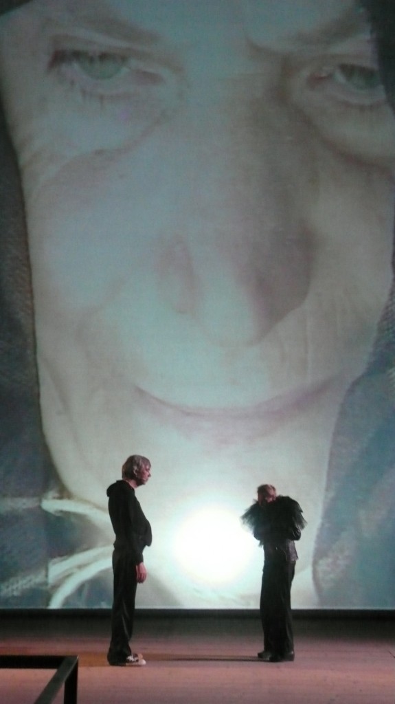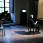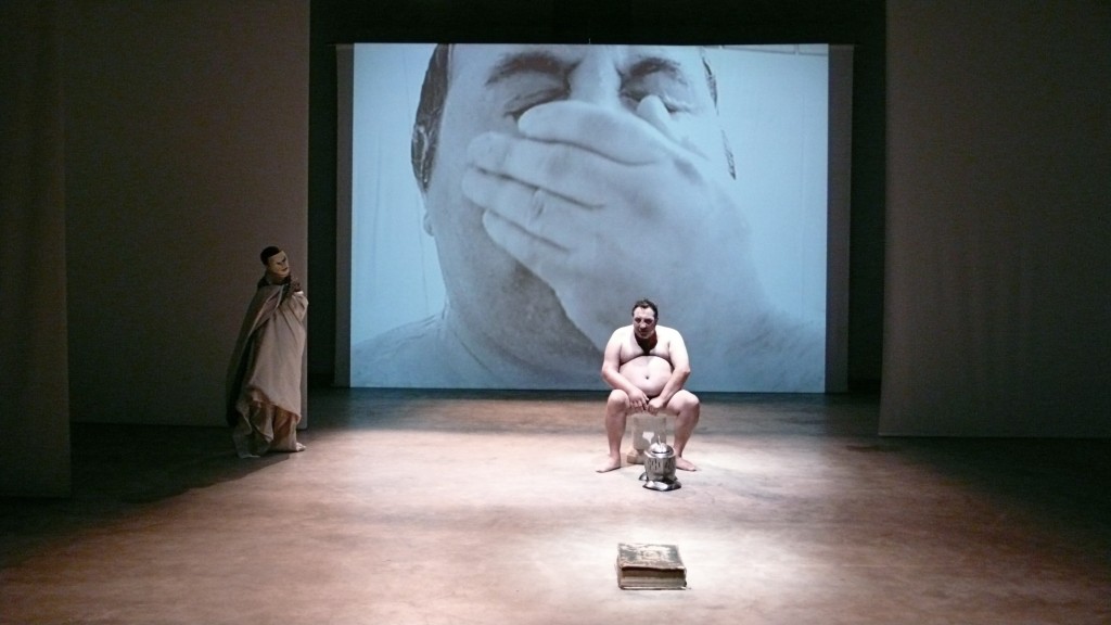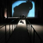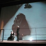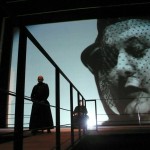 I primi passi nel Palazzo della Pilotta da subito si appesantiscono della grandezza che ci circonda, sulle scale che portano al teatro due attori ci accolgono, a sinistra capiamo che c’è Amleto (Paolo Maccini), neutro, non manifesta un’emozione, sarà la sua maschera naturale per tutto lo spettacolo, a destra Barbara Voghera, è Amleto anche lei, ma la sua interpretazione si oppone diametralmente al primo: si arrampica letteralmente sulla sillabazione della riscrittura di Francesco Pititto, lotta con tutte le forze contro gli impedimenti di pronunzia che le imporrebbe la sindrome di down; cercherà nel suo corpicino una risonanza modulata da continue contrazioni. Sul ballatoio i primi video proiettati (nei quali appare anche il fantasma del padre), ma saranno numerosi e accoglieranno lo spettatore in ogni spazio caratterizzando l’intera scrittura scenica di Maria Federica Maestri. Da sempre questo Amleto è nomade, nel percorso interno dello spettacolo e nella perenne ricerca di spazi non abituali dove installare le proprie emozioni e contraddizioni. Dopo la Rocca dei Rossi e la Reggia di Colorno la collaborazione tra le istituzioni e la compagnia ci ha consegnato questa piccola e fragile utopia del Farnese, purtroppo dissolta con una serata di anticipo a causa del terremoto emiliano.