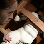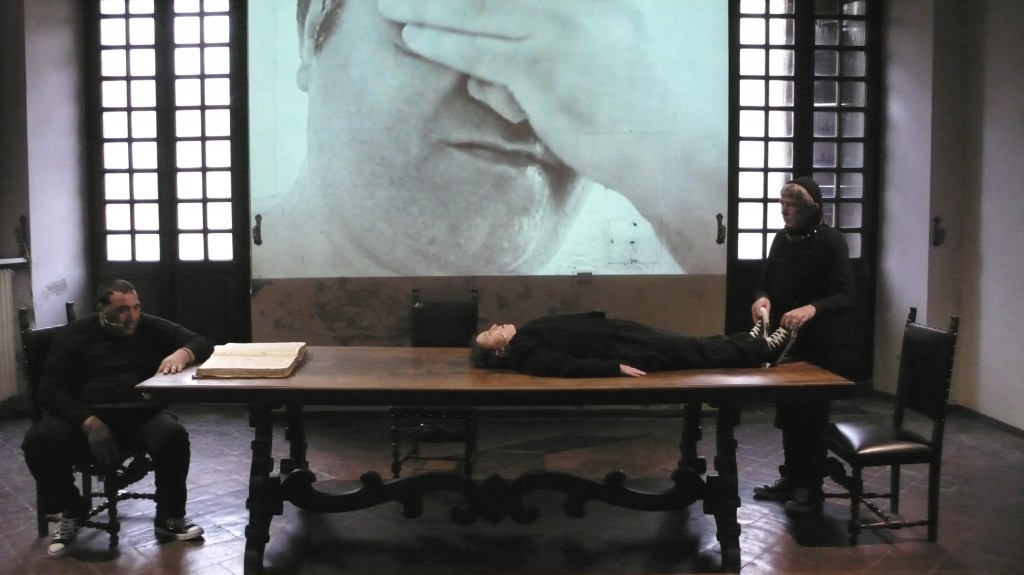Fin dall’inizio di questa esperienza, per noi formativa, abbiamo scritto per immagini ogni passaggio significativo di crescita drammaturgica, dentro e fuori la stesura scenica. Immagini come imagoturgia e testo, immagini come documento della prassi in atto. Dalla traduzione alla riscrittura del testo originario ogni partecipazione individuale è avvenuta assieme alla creazione di immagini. La composizione di queste si è sviluppata, molto spesso inconsciamente, in quadri viventi nei quali gli attori hanno potuto rispecchiare, e per noi rifrangere, tutto il loro coinvolgimento di vita vissuta dentro uno spazio di libertà creativa fatto di regole e relazioni nuove. Il loro arrivo puntuale alle prove, la loro tuta di lavoro nera, la lettura del testo, il riscaldamento corpo-voce, la ripetizione delle azioni, le prove sulla scena, lo spettacolo, le repliche: ogni fase ha proiettato immagini nuove di attori nuovi, si è creata una strana simbiosi tra vero e virtuale in tutto a vantaggio del primo. Non era verità il corpo di Guglielmo? Adesso il nostro Spettro non c’è più in carne ed ossa, è meno vera, concreta, tangibile la sua immagine che continua a comparire sulla scena? In questo caso parlerei di etica dell’immagine. L’etica prende corpo, in tutta la sua potenza, dall’immagine di un corpo assente che ne testimonia – replica dopo replica – l’irrinunciabile volontà di esserci, di poter continuare a vivere un pezzo di vita artistica fatta di riscatto e di autoriconoscimento. Questo vale anche per i compagni di Guglielmo, fatto il funerale continuano a chiedergli: “Chi sei? Da dove vieni? Dal cielo o dall’inferno?” oppure ad accarezzarlo o a vederlo pregare o a volerlo uccidere come re Claudio negli affreschi visivi del Teatro Farnese. Penso siano differenti le immagini di Laurence Olivier o di Carmelo Bene come epigrafi visive appartenenti alla storia del cinema-teatro, in questo caso l’impulso rigenerativo – la resurrezione del corpo “etico” – avviene nella relazione con l’altro, è l’altro che stabilisce il contatto vitale per il tempo del teatro, l’altro attore e gli altri, gli spettatori.