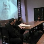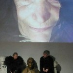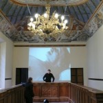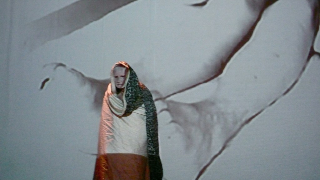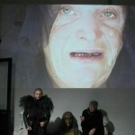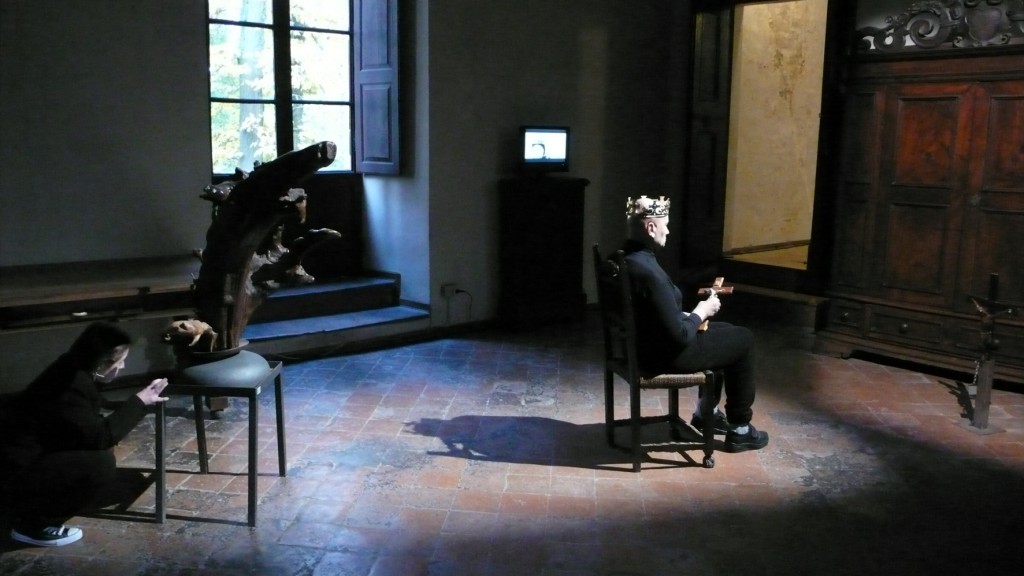 L’aria nella Pianura Padana è più fredda del solito, a San Secondo Parmense c’è una leggera foschia, che rende lugubre questa notte dei primi di novembre, quasi misteriosa. Intorno alla Corte dei Rossi, silenzio e deserto. Così, è più facile immaginare di trovarsi alle porte del castello di Elsinore. Maschere bianche di trucco. Voce amplificata al microfono, che riverbera negli spazi del palazzotto rinascimentale parole di non immediata comprensione perché non perfettamente articolate. Su questa immagine multistratificata, i primi due attori di Lenz Rifrazioni iniziano a guidare il pubblico tra le stanze splendidamente affrescate della Rocca. Una volta saliti per lo scalone, ci si trova in una vera sala delle udienze. E, se il numero degli interpreti è minore rispetto a quanti ne prevede per la seconda scena l’Hamlet shakespeariano, i video proiettati sul fondo richiamano comunque presenze altre: non solo i fantasmi più volte evocati nella vicenda, ma anche momenti altri degli interpreti. Le immagini in due dimensioni si mescolano, si sovrappongono, completano e aprono nuovi orizzonti rispetto a quelle in tre dimensioni. Vedendo filmati che sembrano riprese di prove e/o laboratori, si è implicitamente costretti a considerare sia la vita del gruppo al di fuori della perfomance che la vita dei personaggi al di fuori della scena. Già, perché è proprio tramite una scrematura ad imbuto, che parte dal testo originale, passa attraverso modi di dire familiari e frasi fatte, ma anche attraverso la visione che hanno i membri del progetto, che si arriva alla condensazione adottata per la messa in scena. La combinazione video-azione dal vivo, da anni cara al Lenz, si ripete stanza dopo stanza. Addirittura, se ne attraversano alcune in cui ci sono solo schermi che portano avanti, diluendo all’infinito, l’uscita di scena di un personaggio. In un altro caso, il video è proiettato sul pavimento e calpestato da un Amleto in lotta coi fantasmi. Fino alla penultima scena, in cui c’è solo il video a condurre verso le conclusioni della storia e della sua ‘morale’, successivamente esplicitate in presenza di tutti gli attori, e di conseguenza di tutti personaggi, nel salone principale.