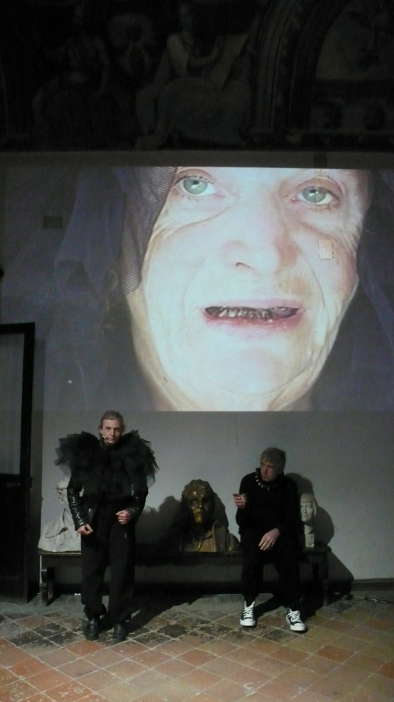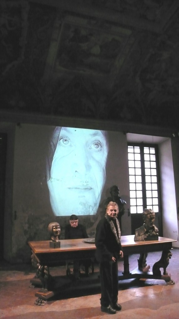 Lo spettacolo, Hamlet, inizia ai piedi della scalinata della Rocca e, come in altre creazioni di Lenz, si snoda tra gli ambienti mozzafiato di questo monumento di campagna che ospitò, secondo il Vasari, un Parmigianino in fuga da Parma dedito a misteriosi esperimenti di alchimia. Gli attori partono indossando le parole di Shakespeare, nella traduzione che scalza stereotipi e facilitazioni verbali per esaltare i punti oscuri o illuminare gli stridori del testo. Poi, a poco a poco, le perdono e le ritrovano, facendo emergere il loro modo di essere, il loro “qui” contrastato da quel continuo “non qui” che è stata la malattia, la follia, la reclusione, la separazione dal mondo, il faticoso ritorno, la vecchiaia, in tensione con un testo impregnato di politica follia. Amleto si sdoppia o si triplica su vari corpi, in quello minuto e squillante di Barbara, nelle parole banali, quotidiane ma ricche del fascino dell’affabulazione da bar di pianura di Paolo Maccini, in quello debordante e pacioso di Enzo Salemi. Dietro il legno scuro della sala del Consiglio, sotto un Bellerofonte su Pegaso in lotta contro una Chimera vomitante fuoco, lo spettro, in carne e video, diventa l’espressione corrucciata, sdentata, terribile di Guglielmo Gazzelli, come un incubo emergente dagli inferi della follia, riprodotto sul muro come cadavere in un’obitoriale filmato in bianco e nero. Polonio sarà un altro vecchio vecchissimo, quasi immobile, incapace di produrre la merce del testo, parole, parole, parole, nascosto comicamente dietro una porta sradicata dal muro a spiare Amleto, nelle sembianze di Luigi Moia. Tutti sono imbiaccati di pallido umore lunare, vestiti di nero con scarpette da basket gli attori e i personaggi, tra quadri e affreschi che evocano altre metamorfosi, mitologiche e favolistiche, Apuleio e Esopo.