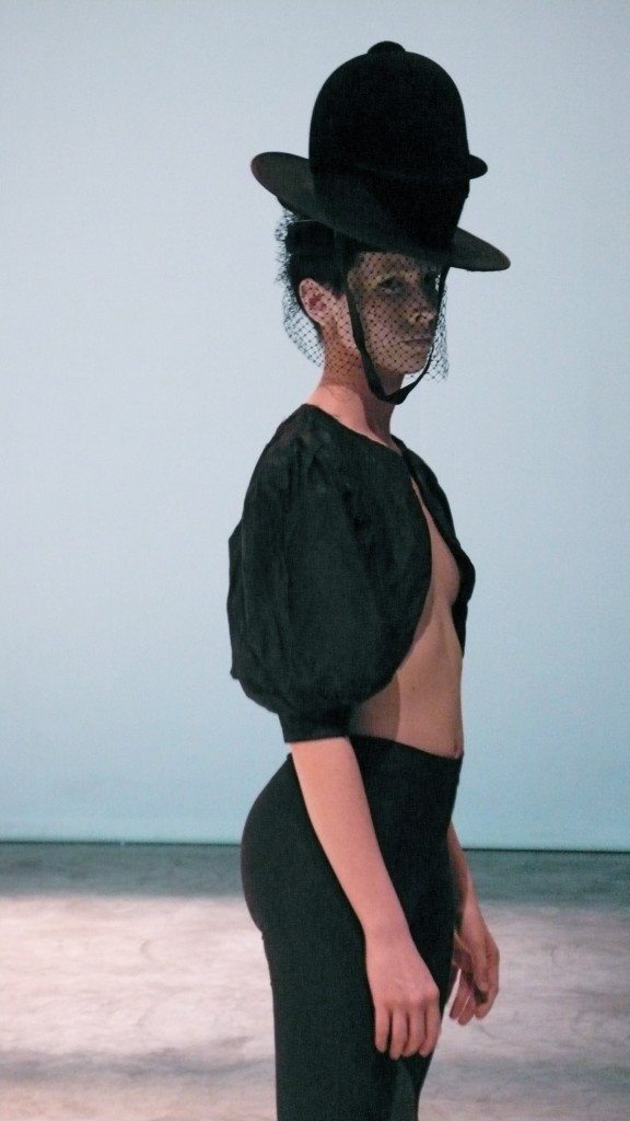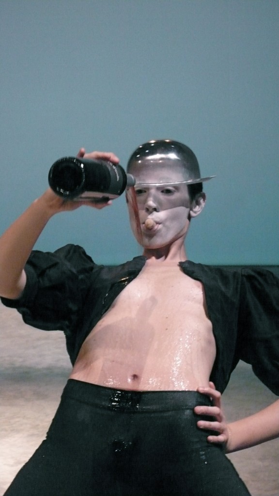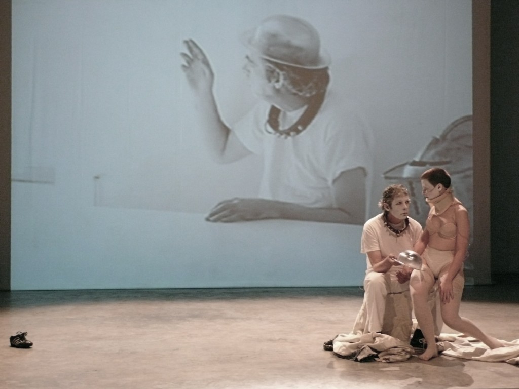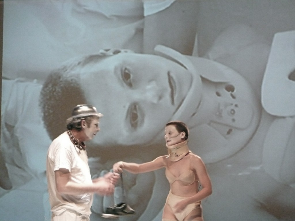 Nell’incontro con il fantasma del padre il Principe Amleto, ornato da un cappellino di metallo e da un collare borchiato come incastonati nel corpo dell’interprete, colma di parole ossessive il dramma incestuoso della madre e il gesto omicida dello zio cercando nella visione violenta di quelle immagini la sicurezza della vendetta. Ofelia, ferita dalla pazzia nella sua bellezza, costretta alla fissità di un collare ortopedico, restituisce ad Amleto tutte le parole e le cose che li avevano legati in amore, segni materici di un cantico d’addio che si concentra in un gesto finale ferito da tragicità e sofferenza. Muovendosi sulla scena come elementi meccanici Amleto e Ofelia conservano nella memoria tutto il dolore della separazione da se stessi e dal loro amore.