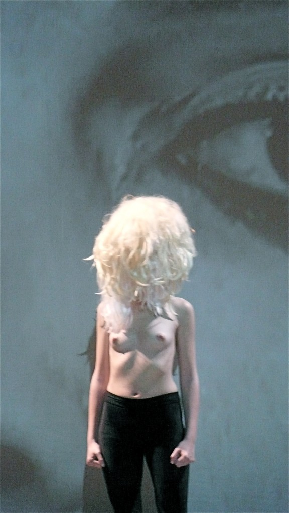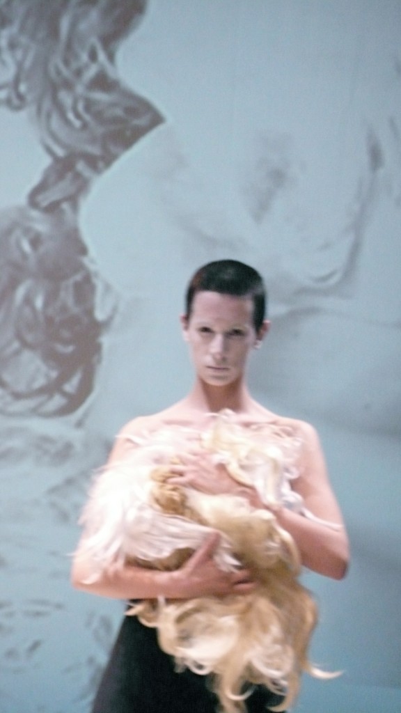 Lo spettro lo rivediamo poi, con bella invenzione registica, nei panni di re Claudio, l’usurpatore, l’assassino del fratello, lo zio, l’altro padre padrone del fragile protagonista. Insofferenze terribili sbottano in questo personaggio-attore tirato a un incalzante ritmo sempre irato, mentre una rassegnata dolcezza e abbandono traspare dai primi piani della regina di Liliana Bertè in video, in varie stanze, incarnata in un ingombrante Franck Berzieri en travesti con veletta. Appare Laerte (Mauro Zumino) o scompare da qualche scena (gli attori, ci hanno detto, in alcuni casi non ce l’hanno fatta ad arrivare alla fine di un processo di lavoro lungo, impegnativo).