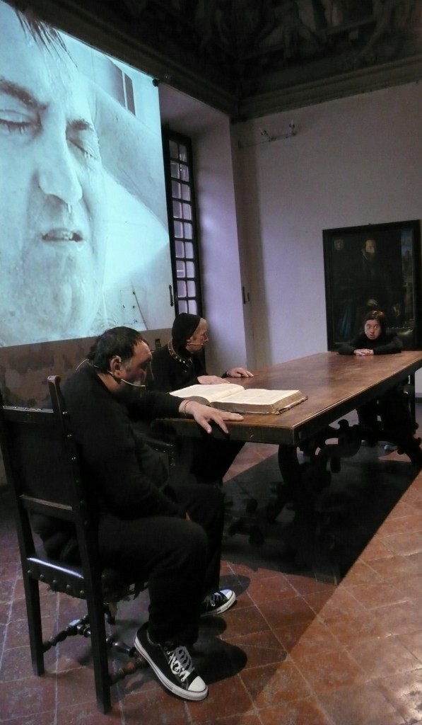 All’interno della maestosa arena barocca di legno inizia il viaggio spaziale e mentale che si snoderà nelle sale della Pinacoteca e nel retropalco – con un prologo sullo scalone esterno e il ballatoio –, per ritornare infine nella vasta platea vuota. Qui una lunga passerella la unisce al palcoscenico. Al centro siede la regina Gertrude mentre l’usurpatore Claudio sosta dietro uno schermo. Entrambi li spiamo replicati in un film autonomo e colloquiale in cui il principe della straordinaria down, Barbara Voghera, inveisce contro di loro. Da qui seguiremo l’Amleto triplice, sdoppiato e uno, simile, in Paolo Maccini, a Buster Keaton; pedineremo queste presenze spettrali, clown, relitti, che ci condurranno nella fitta trama di un labirinto della mente dove dialogheranno tra busti scultorei, statue, quadri e affreschi (…) Ci resta l’indicibile emozione di un viaggio tempestoso tra onde di marosi etici ed estetici, traghettati da questi compagni di navigazione, corpi di dolorosa poesia e d’imperfetta bellezza che l’arte del teatro ha liberato dall’involucro della mente.
