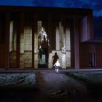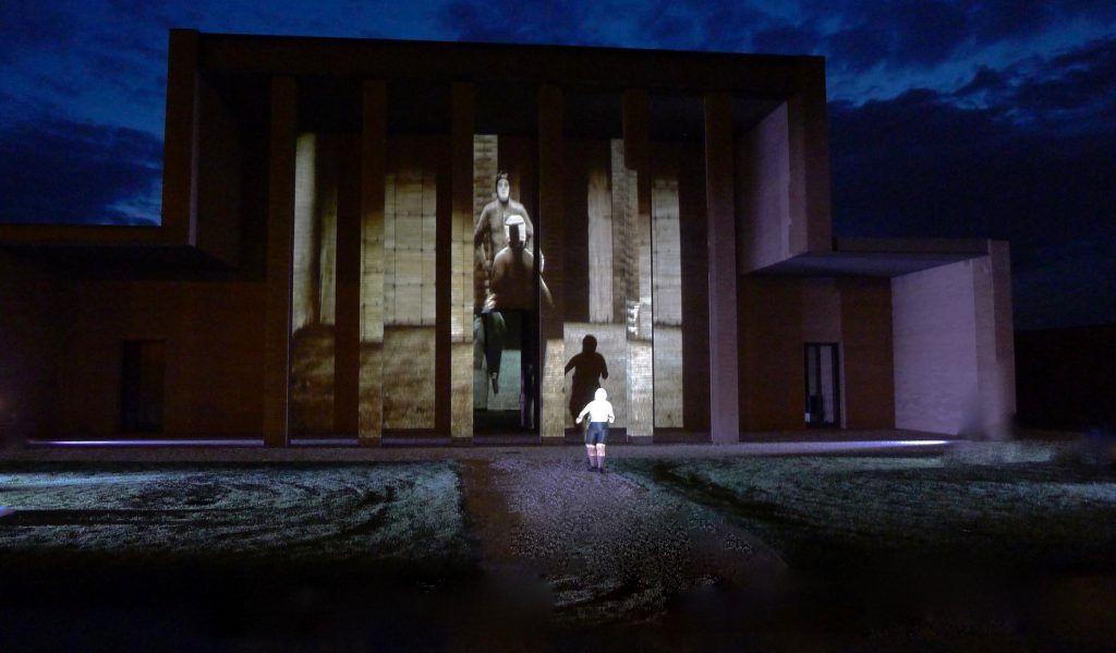 La nuova installazione trova luogo in un palazzo che comprende tutti e quattro i temi: l’imponente Tempio della Cremazione di Valera (Parma), con interni ed esterni per la follia più grandiosa, il passo più importante, un nuovo palazzo di Atlante dell’illusione conclamata e poi svelata, cioè la vita vera, dove paladini e donne in fuga non si riconoscono l’un l’altro se non nel reciproco trapasso, nell’incessante “cercare senza mai trovare“, con gli occhi sulla Luna a guardarsi sulla Terra a dimenarsi invano.