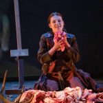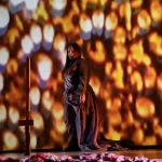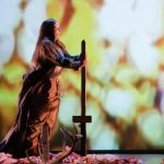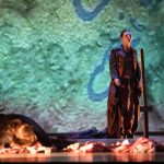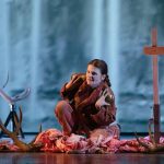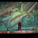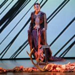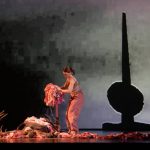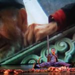Valentina Barbarini intercala agli interventi dei due cantanti la sua presenza sempre vigile, in equilibrio tra la necessità di dare voce alle parole del personaggio e un linguaggio fisico che svaria per movimenti, posture e gestualità tra l’animalesco, l’altero, il sensuale, l’iconico. Il rapporto di Ifigenia con Agamennone si articola poi lungo l’asse centrale della navata, in fondo alla quale, oltre a veder scorrere, sull’abside, le proiezioni di Francesco Pititto, vediamo campeggiare un letto a castello bianco ricolmo di coperte: altare, tenda, trono, talamo del re, dal quale egli impone il proprio volere. more (…)