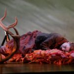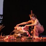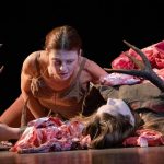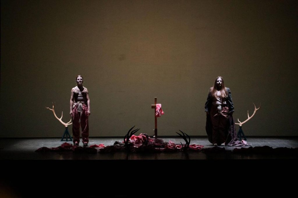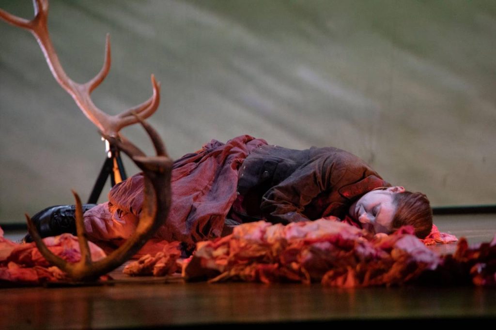 L’installazione scenica curata da Maria Federica Maestri sarà costituita da un altare materico ‘tenero e crudele’ ispirato alle opere organiche di Joseph Beuys; alle spalle della scena una iconostasi ritrae vecchie divinità ammutolite davanti alla strage che sta per compiersi. Nessuna cerimonia, nessun padre da odiare, nessuna madre da desiderare, nessun passato e nessun futuro, solo un ‘al di qua’ anonimo ed insanguinato. Come la cerva ferita a morte, una generazione senza identità corre incontro al proprio destino tragico. Simile al corpo straziato di Pierpaolo Pasolini, principessa destinata al sacrificio, l’innocenza della vittima è perenne monumento all’orrore della violenza.
