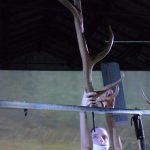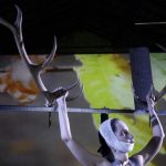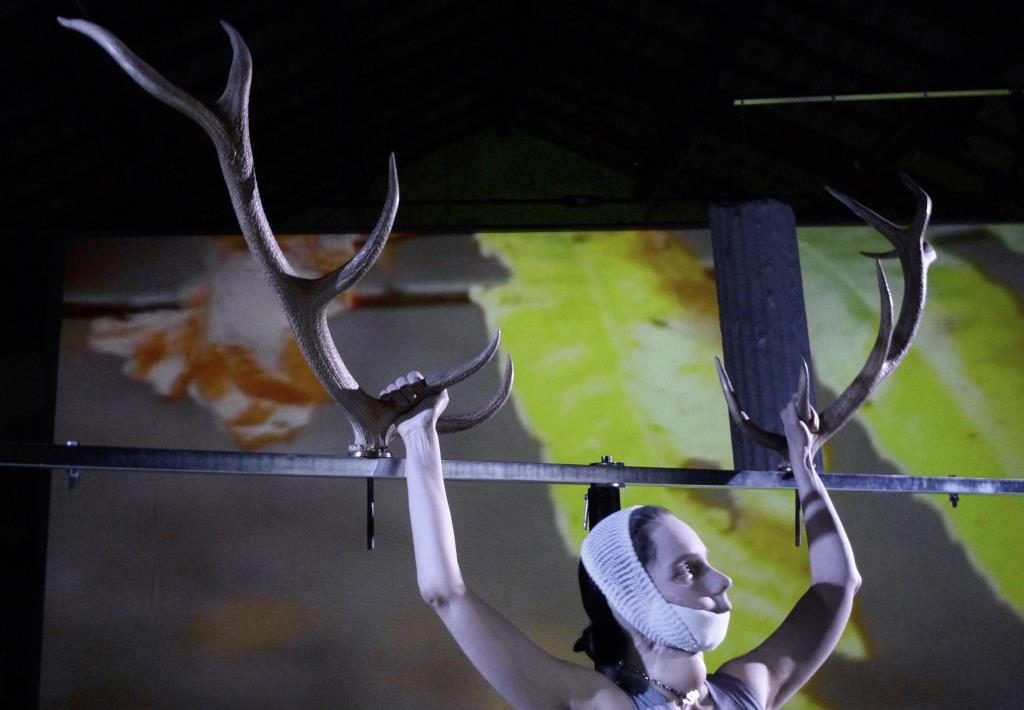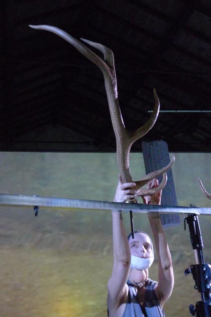 Al centro dell’area scenica, sospese tra i rami metallici di piante meccaniche, si stagliano le corna della cerva sacrificata al posto di Iphigenia, il giorno in cui il padre – Agamennone – per propiziare la partenza delle navi alla volta di Troia, aveva deciso di sgozzare la figlia.
