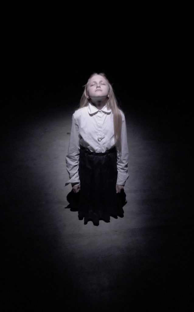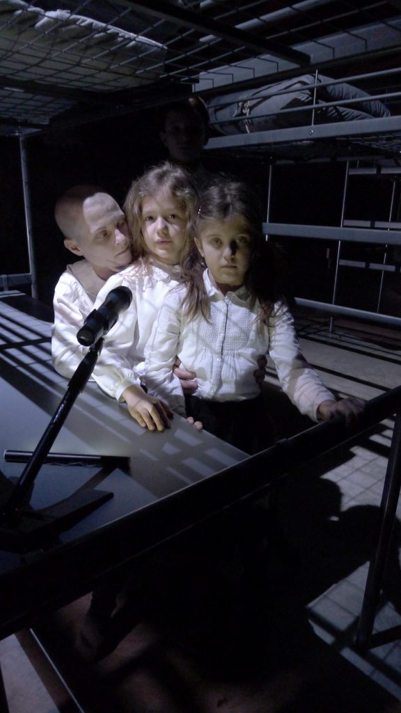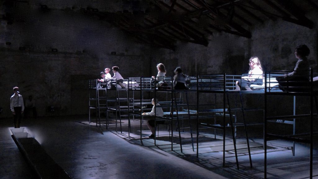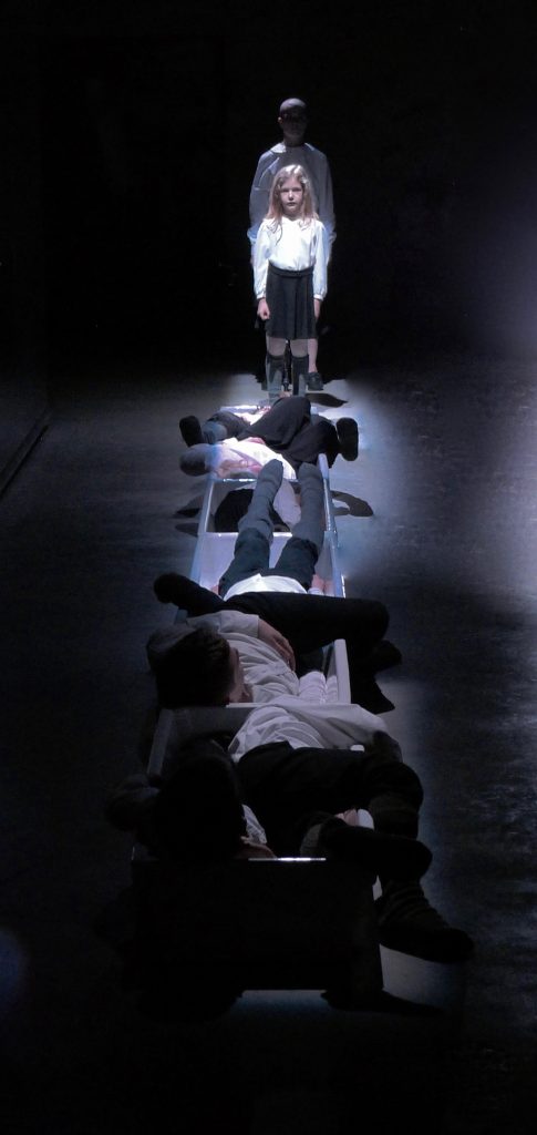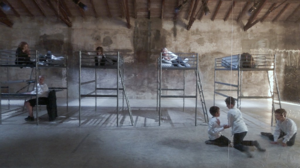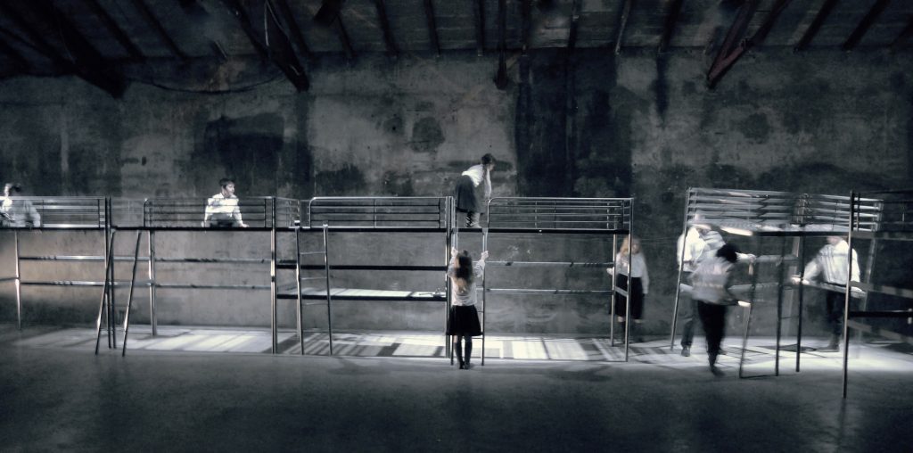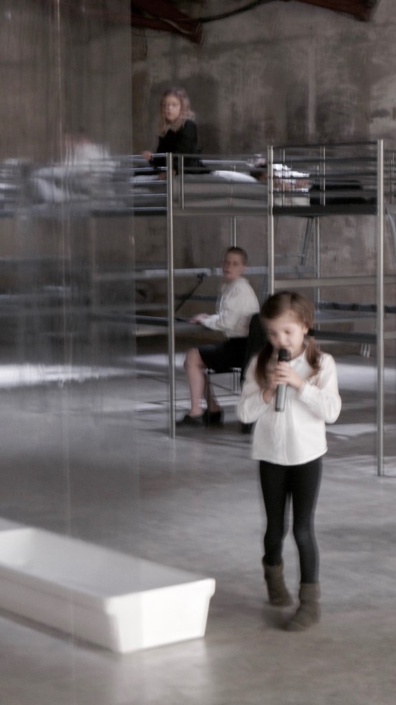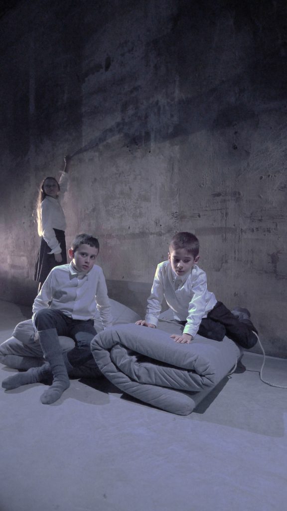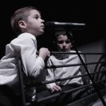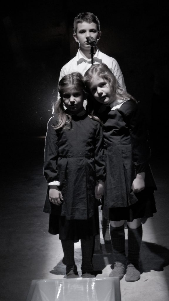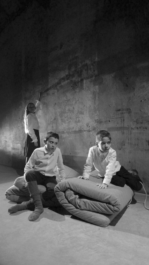 La drammaturgia di KINDER contiene diverse parti di questa Storia: l’elenco dei campi di lavoro e di sterminio, le lettere di una madre al “Signor Questore della Provincia di Parma”, poesie anonime di bambini ebrei dei campi, dialoghi immaginari tra i bambini di Parma con altri due bambini dei campi, Tereszka e Papo, una versione ritradotta di “Tenebrae” di Paul Celan ma il nucleo drammaturgico rimane il canto. Ed ecco la presenza/resurrezione dei bambini del Coro di Voci Bianche diventare essenza performativa insieme ad un’unica attrice, riflesso e rifrazione di sei vite troncate, tramite i loro sguardi silenziosi e poi voci recitanti e intonanti un unico Lied di Mozart/Overbeck “Komm lieber Mai_” che parla di un Maggio imminente, di violette, di giochi nella notte e nella neve, di un libero paese amato.