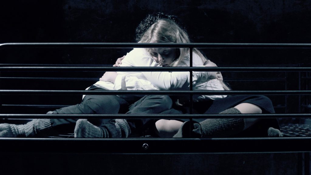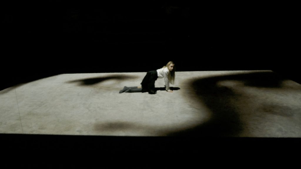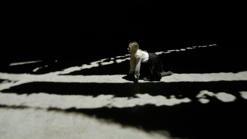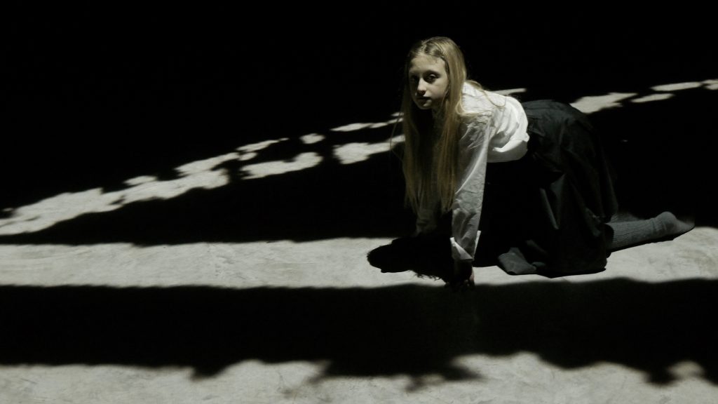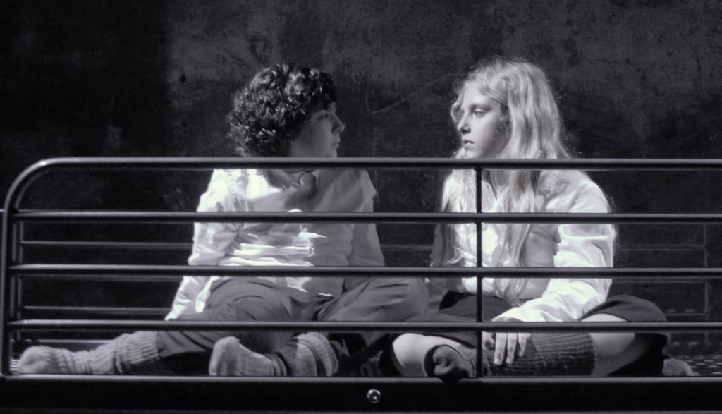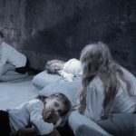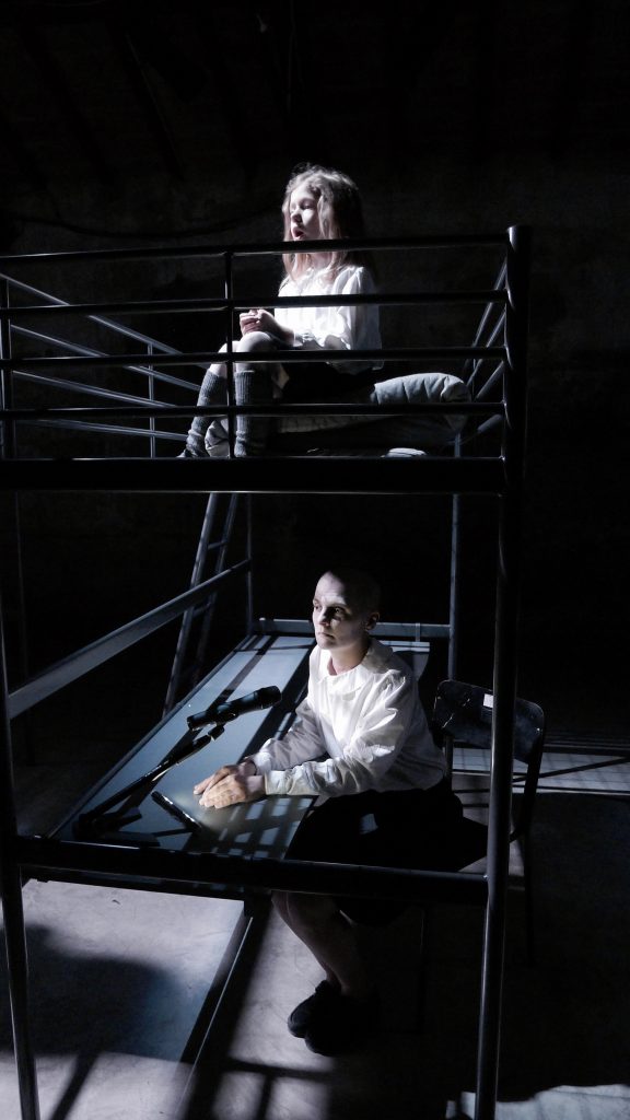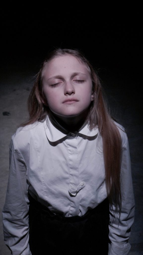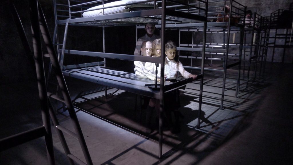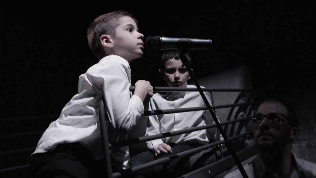 La drammaturgia di KINDER contiene diverse parti di questa Storia: l’elenco dei campi di lavoro e di sterminio, le lettere di una madre al “Signor Questore della Provincia di Parma”, poesie anonime di bambini ebrei dei campi, dialoghi immaginari tra i bambini di Parma con altri due bambini dei campi, Tereszka e Papo, una versione ritradotta di “Tenebrae” di Paul Celan ma il nucleo drammaturgico rimane il canto. Ed ecco la presenza/resurrezione dei bambini del Coro di Voci Bianche diventare essenza performativa insieme ad un’unica attrice, riflesso e rifrazione di sei vite troncate, tramite i loro sguardi silenziosi e poi voci recitanti e intonanti un unico Lied di Mozart/Overbeck “Komm lieber Mai_” che parla di un Maggio imminente, di violette, di giochi nella notte e nella neve, di un libero paese amato.