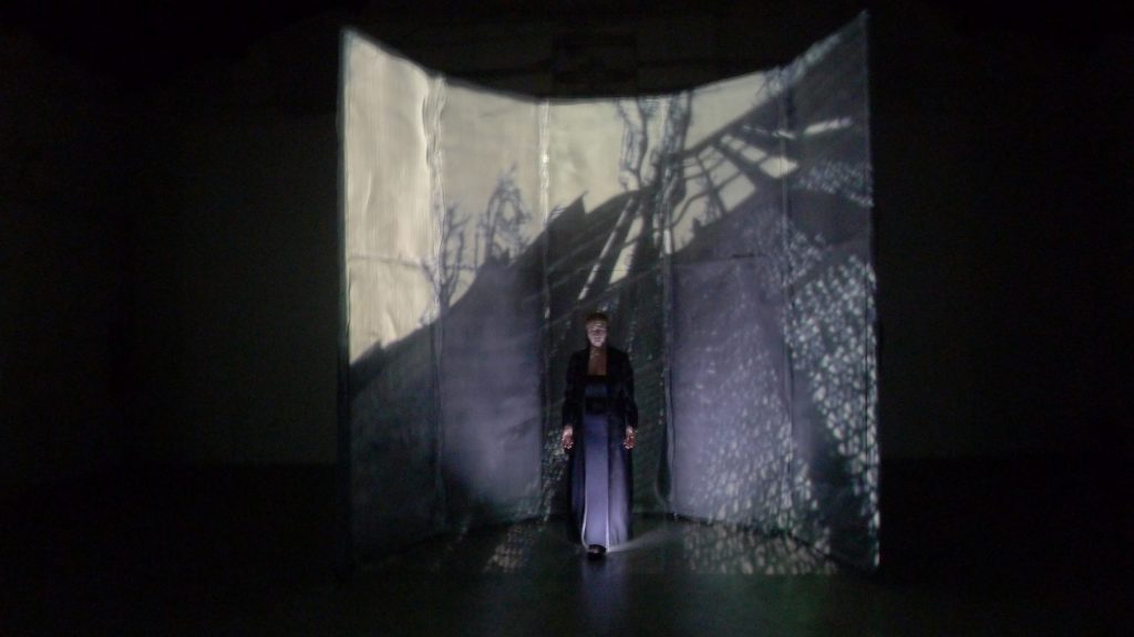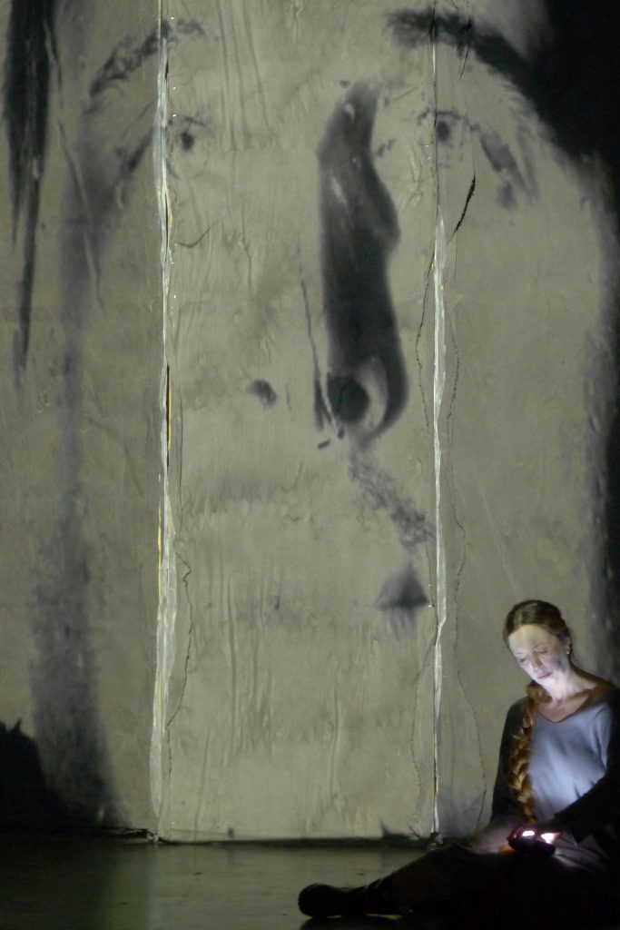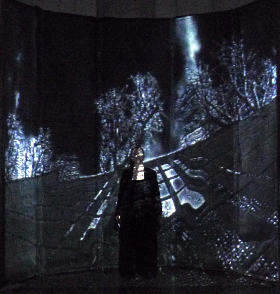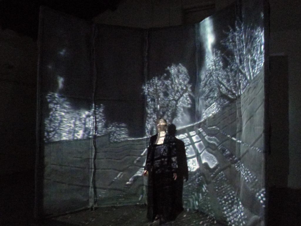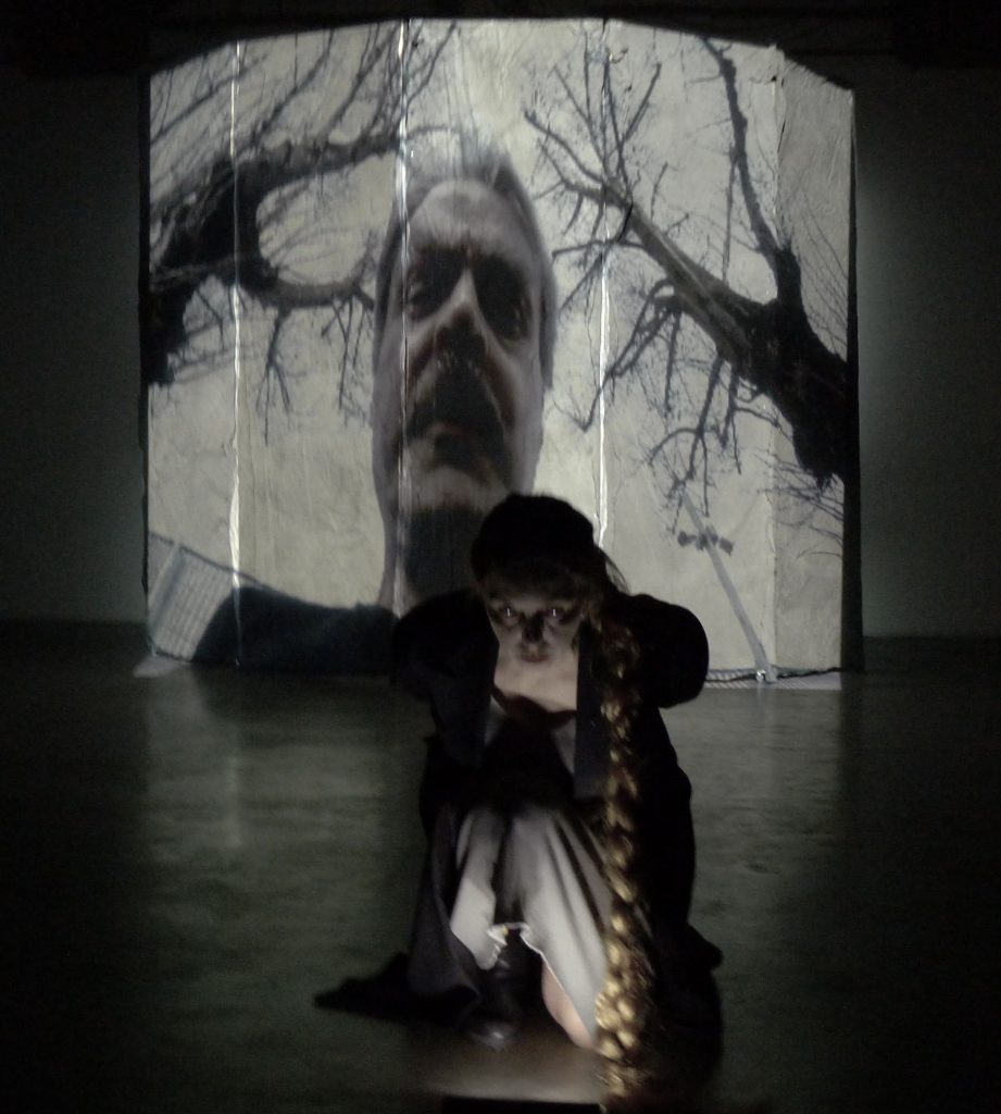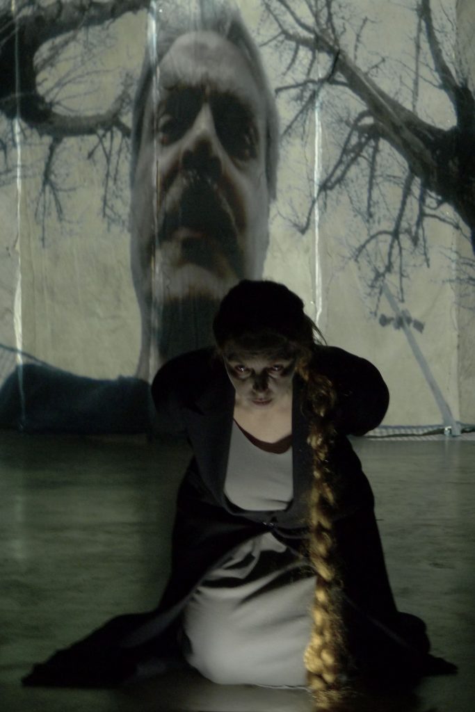 (…) Senso di colpa che è fulcro e snodo anche della personalissima (come sempre originale e visionaria) versione del “Macbeth”pensato e architettato dai Lenz nelle loro forme deturpate, video nebbiosi sfumati, voci disturbanti come crepe a creare un tappeto dove i sensi si perdono e defluiscono, si miscelano come vasi comunicanti, si frantumano. Il canto shakespeariano sulla colpa e sui fantasmi che assillano la mente del colpevole qui diventamonologo (Sandra Soncini vestale rituale imperturbabile) ma supportato da un coro, in video, composto dai volti frammentati dipazienti detenuti in Ospedali psichiatrici giudiziari (Opg). Pezzi di occhi e denti (di chi ha commesso realmente reati e si è macchiato di colpe indelebili) proiettati su una struttura circolare che ingloba come placenta, protegge come mano, si chiude come persiana, sbadiglia come confessionale, che è paravento dove nascondersi, grotta e abbraccio e curva. (…)