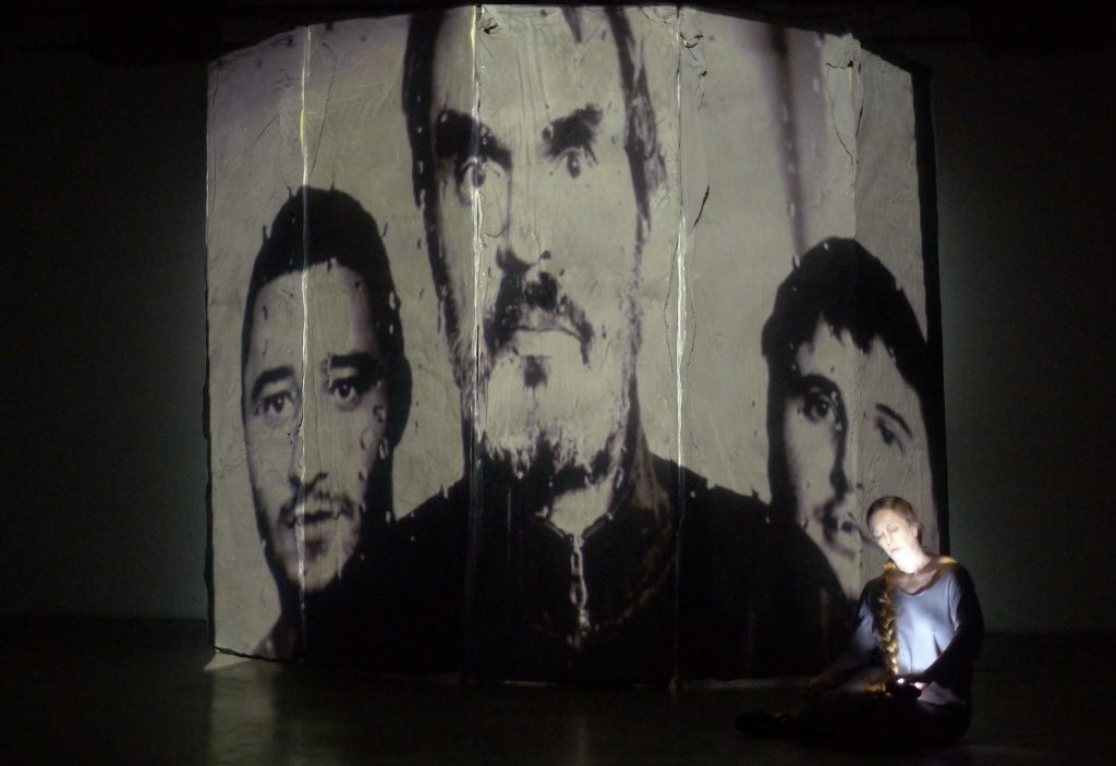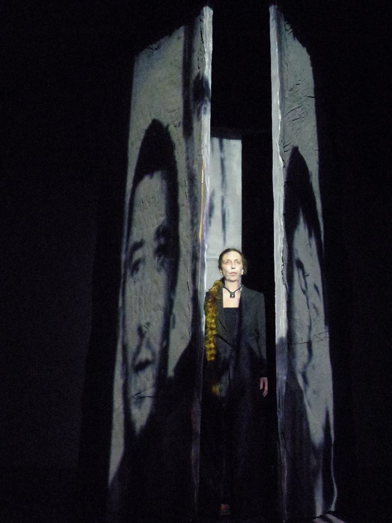 (…) Sono volti di uomini allucinati, sfuocati, bruciati: un fluire di ciglia, capelli, barba, bocca, denti, spezzati, divisi dalle giunture che tengono insieme la scenografia, punti di sutura, rammendi lacerati come i sacchi di Alberto Burri. Quando quella caverna, quel monolite della mente omicida si apre, svela Sandra Soncini, Lady Macbeth vestita di nero su una sedia girevole. Oscurità alienata con un cuore che pulsa. (…)