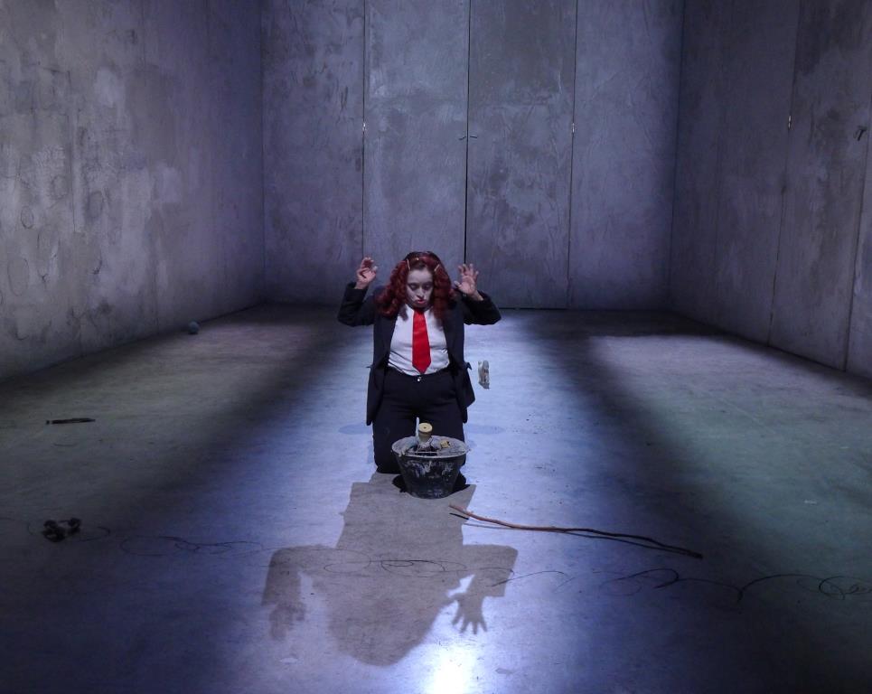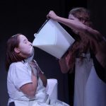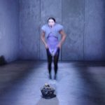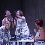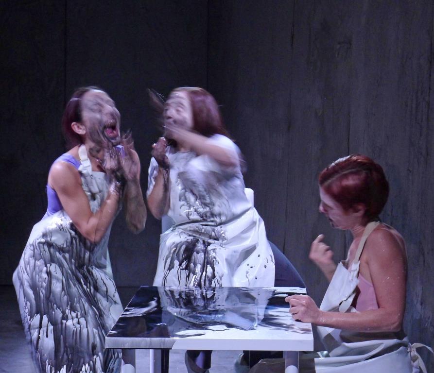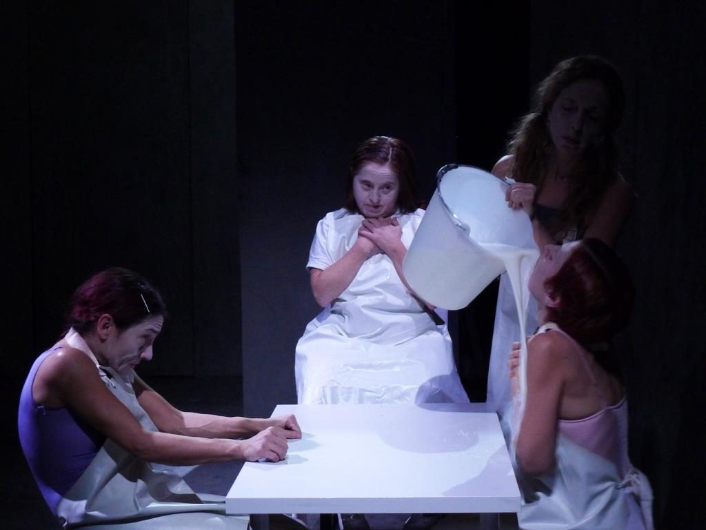 Nel Latte, il secondo episodio tratto da Le Coefore, l’installazione scenica predispone – simmetricamente al nido/letto abitato dalla madre Clitennestra, alcuni elementi ordinari e attivi della fisica domestica, una tavola artificialmente nutritiva – inondata dal latte nero dell’odio ispirato alla Todesfuge di Paul Celan e ai vortici liquidi di Anish Kapoor- e una tana/culla in cui Oreste, si nasconderà per sfuggire alla furia delle Erinni.