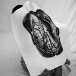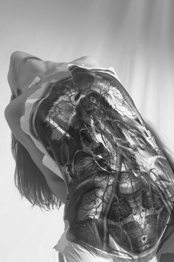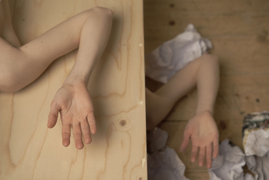 La performance A sangue freddo trae la sua origine da una serie di immagini realizzate per un progetto fotografico di Silvia Costa e Silvia Boschiero, come una sorta di appendice temporale, nel quale il corpo immortalato si fa materia di studio di un processo di disgregazione degli strati. Dal bianco e nero si passa al colore, ci si stacca dal piano per rivolgerci a un tutto tondo. Il pubblico è chiamato a osservare come in una sala anatomica, il corpo umano nelle sue parti e nella sua morfologia. Il suo sguardo è come un bisturi tagliente e impietoso, che disseziona, penetra e sconvolge l’adesione fra interno ed esterno, fra superficie e volume, tra massa e forma. Il corpo vive, ma implora il ritorno all’inorganico.