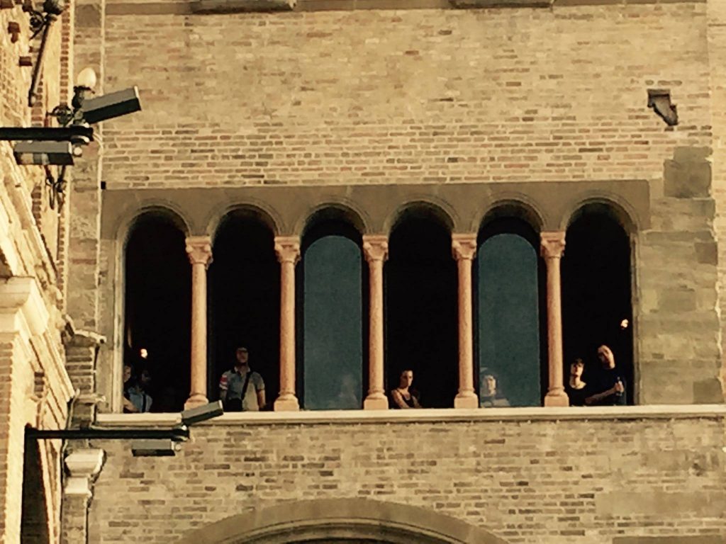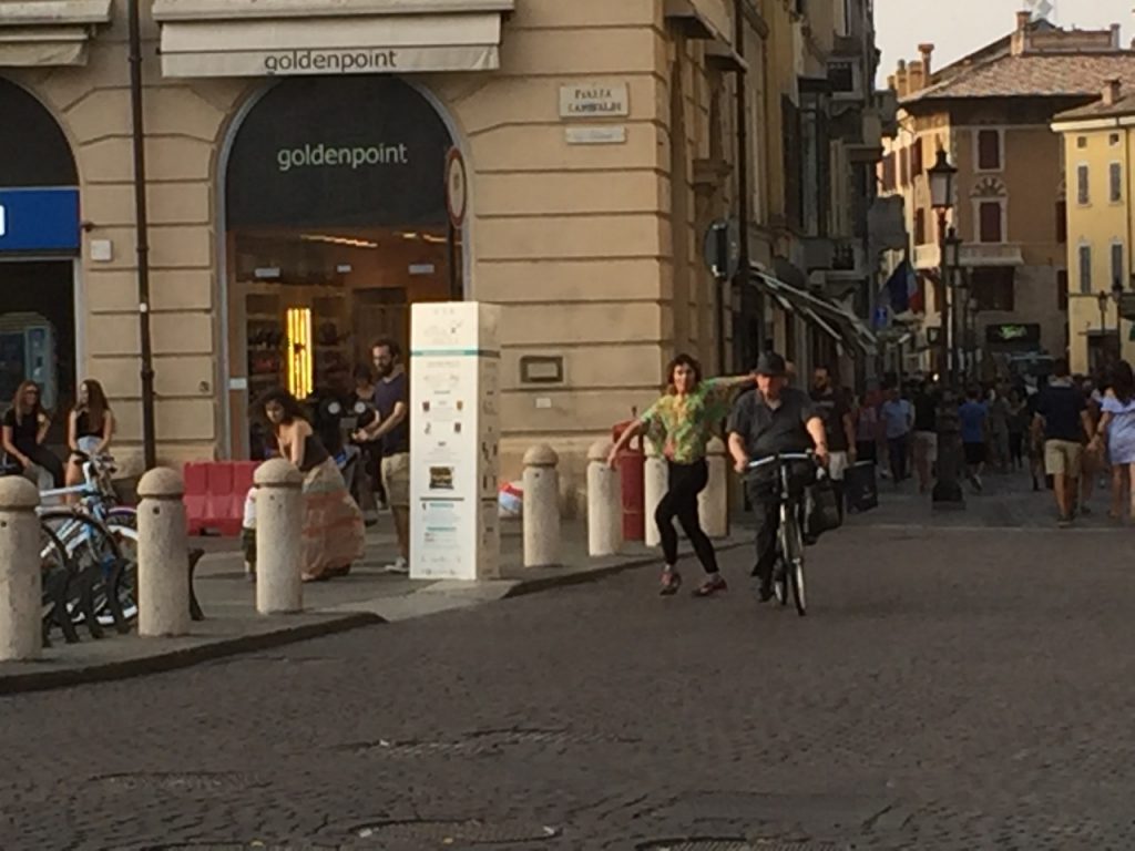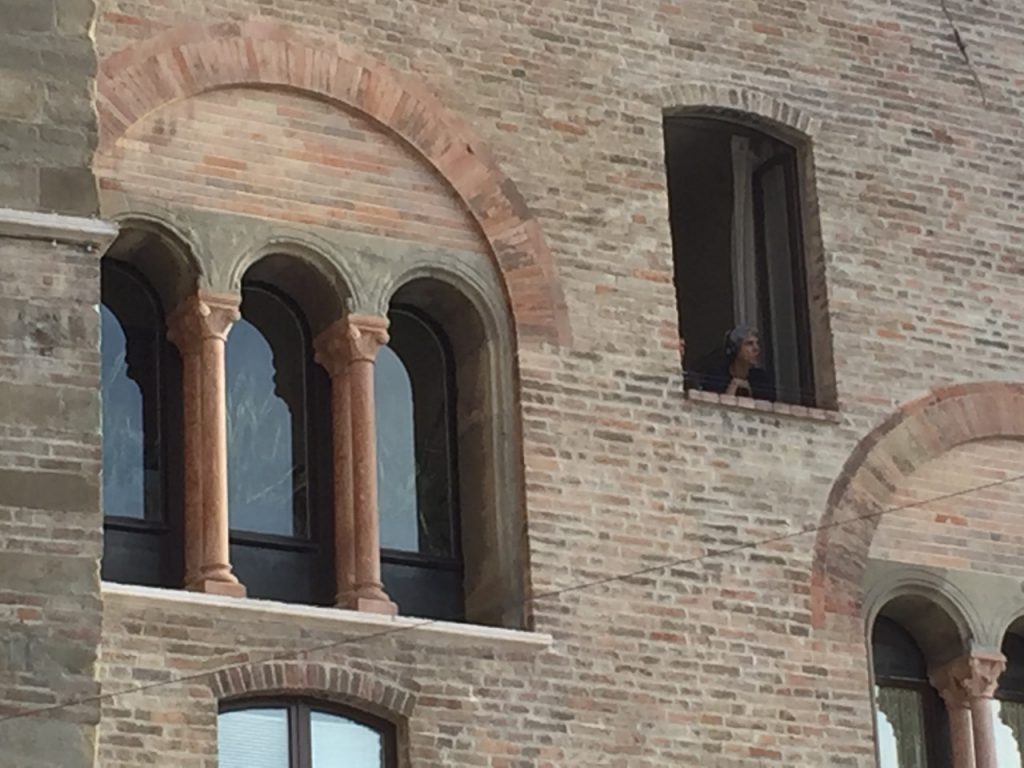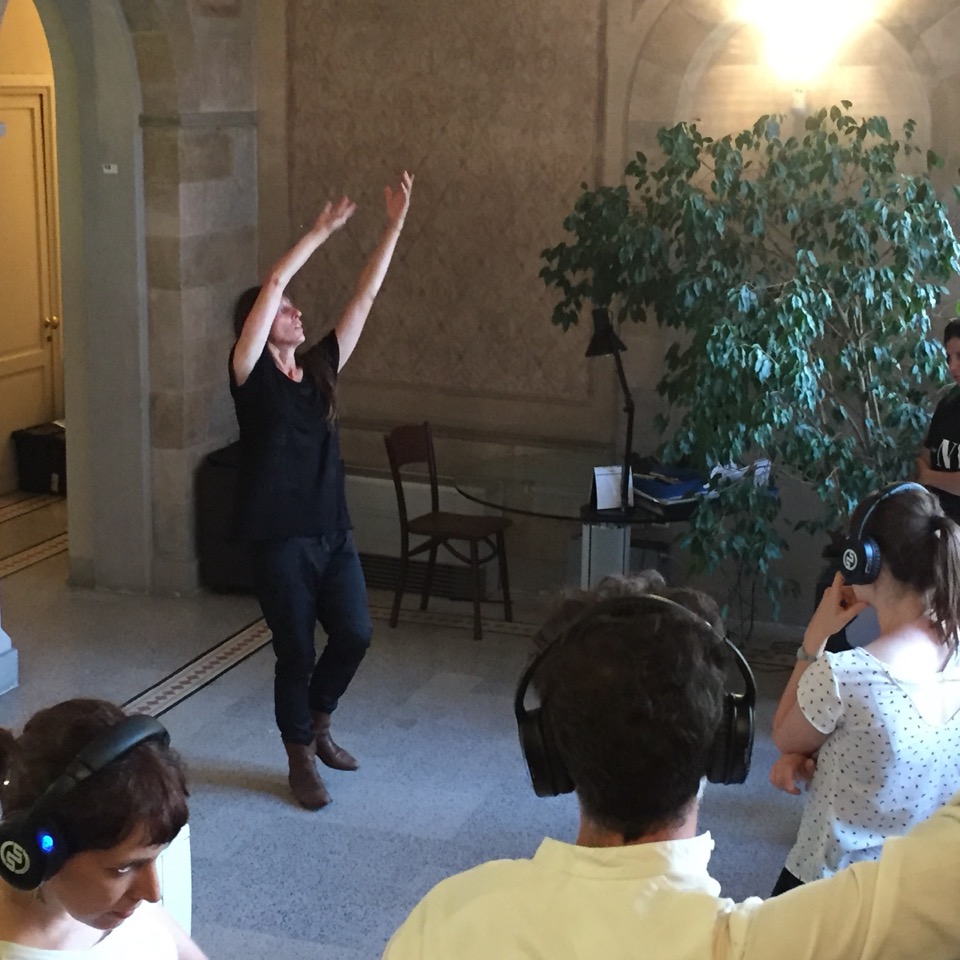 Veduta > è un formato modulare, con cast e durate variabili, dedicato alla città e alla visione prospettica del paesaggio urbano. Il pubblico fruisce la performance in cuffia, affacciato ad un punto panoramico della città da individuare di volta in volta. Il punto di vista è ampio e può interessare spazi molto vicini e molto lontani, collegati tra loro dalla traccia sonora (registrata in olofonia con una forte impronta cinematografica) e dalla dislocazione dei performer. Nell’episodio di Bologna che ha inaugurato questo formato, il percorso della performance spaziava dalla Sala Farnese del Palazzo Comunale alla Piazza Maggiore, fino alla cima della Torre degli Asinelli. La veduta urbana viene trasformata dall’ascolto in un luogo che galleggia tra il presente e il possibile; lo spettatore si immerge in un paesaggio che non è più semplicemente ciò che gli si para davanti, ma – così come in una allegoria sacra – un concentrato di coincidenze e configurazioni che sembrano rimandare ad altro. Il reale è ora offuscato ora nitidamente messo a fuoco dal suono, che presiede al potere immaginifico della visione e rende possibile la moltiplicazione dei dettagli in un luogo dalle coordinate immaginarie. Strani complotti e misteriose attività ridisegnano il qui e ora per rileggere l’urbanità attraverso posture e segni di un altrove, indagato da danze asciutte che possono essere molto vicine o lontanissime, all’orizzonte. Dentro e fuori. La danza è dunque letteralmente un punto di vista sul mondo che inscrive e afferma la figura nello spazio della comunità suggerendo allo stesso tempo una via di fuga.