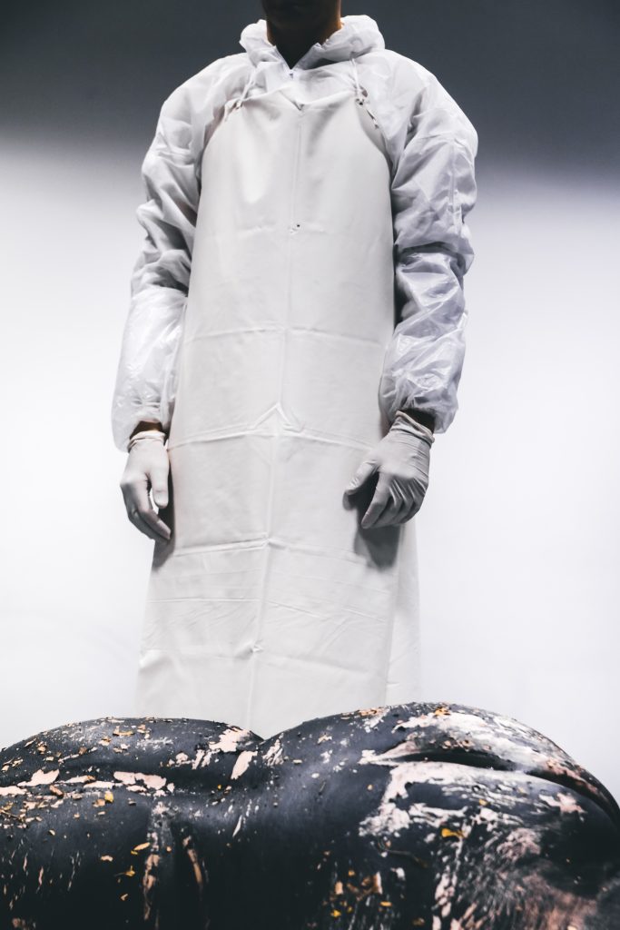 Uno che abbia scelto o a cui sia toccato uno sguardo diverso sul mondo, uno che sia chiamato a rifondarsi continuamente e a rifondare la realtà che lo circonda, necessita a volte di un tempo in cui calarsi profondamente nelle ragioni della sua diversità, un tempo appartato e inspiegabile in cui dedicarsi ad un esercizio di ri-orientamento che lo impegni totalmente e gli offra il conforto della compagnia di alcuni buoni amici. Perfino a partire da un tema esotico e fantasioso come il mito della sirena. Tutto qui. VOUS ÊTES PLEINE DE DÉSESPOIR è questo esercizio di coabitazione e di riflessione su uno dei tanti miti della nostra cultura occidentale che propone in maniera ambigua e complessa il tema della seduzione, del sacrificio e della femminilità. La sirena che abbiamo immaginato non ha niente a che vedere con l’ottimismo di certe pose o di certe figure della società contemporanea. La nostra sirena è una creatura scartata, fall, bankruptcy, fished by all too domestic sea depths. E’ An unrecognizable dark mass, un corpo anfibio immobile, silenzioso che emana una disperazione sorda e ostinata, quasi fosse il canto invincibile e dolente di una divinità scaduta eppure ancora attraente, docile e piena di mistero.